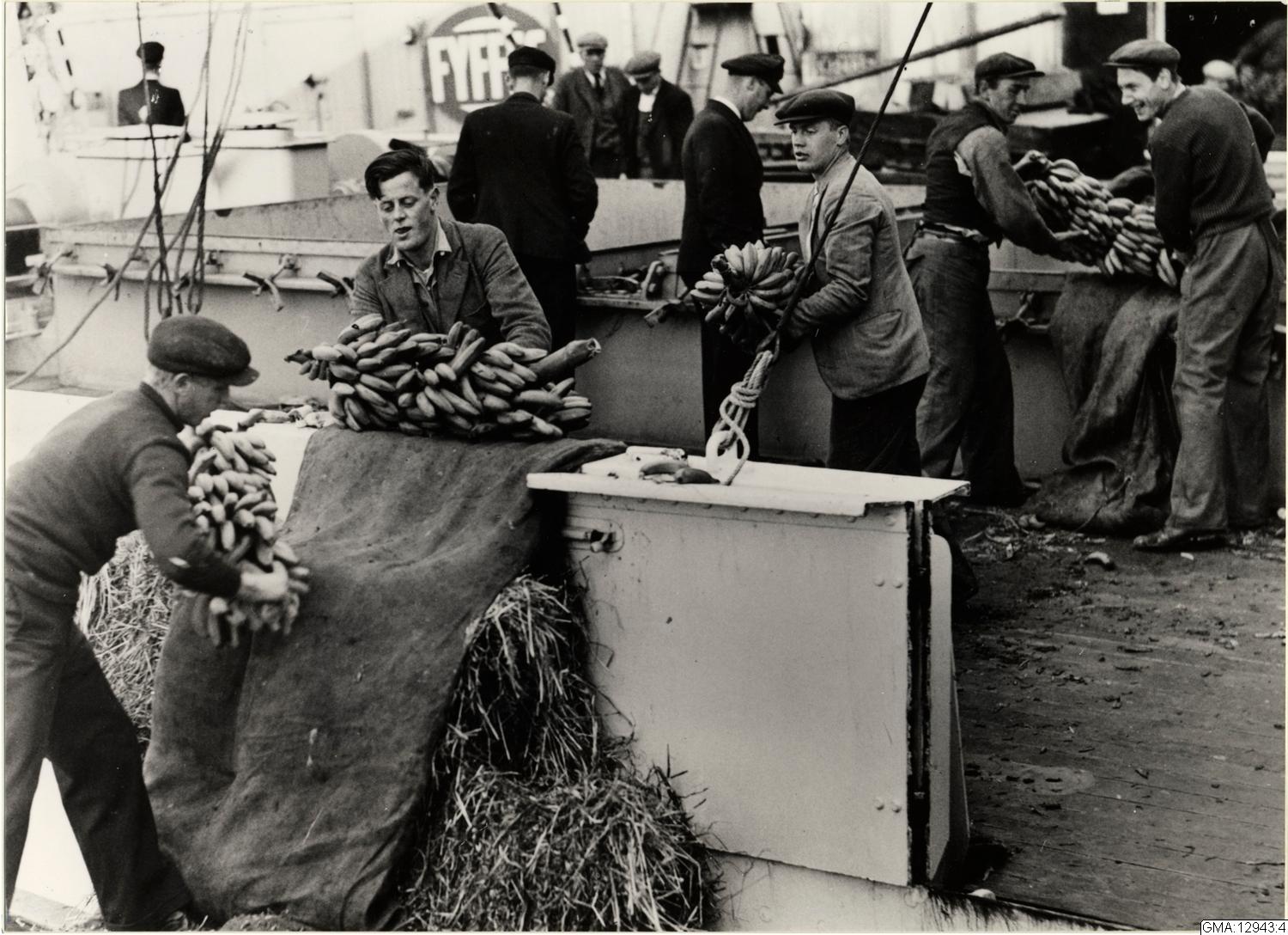 hamn; kaj; fartyg; arbetare; frukt; banan; stuveriarbetare