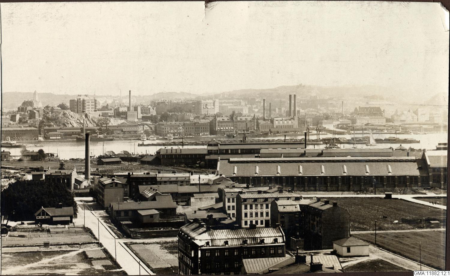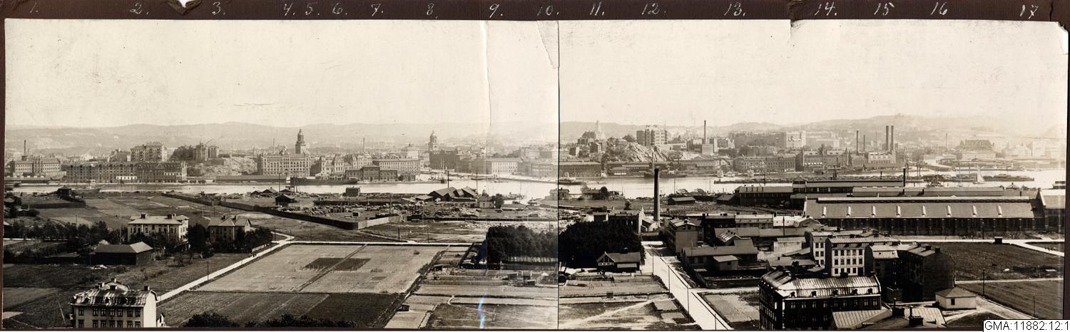 18) Skorstenarne å Elektrisitetsvärket, 19) "Kungshöjd", 20) Vasakyrkan 21. Skansen "Kronan" 22.) Oscar Fredriks kyrka 23) Tornspetsen av St. Johannes kyrka och där bakom höjderna av Masthuggsbärgen 24.) Konfektions Akt. Bol. Wettergens byggnadskomplex.