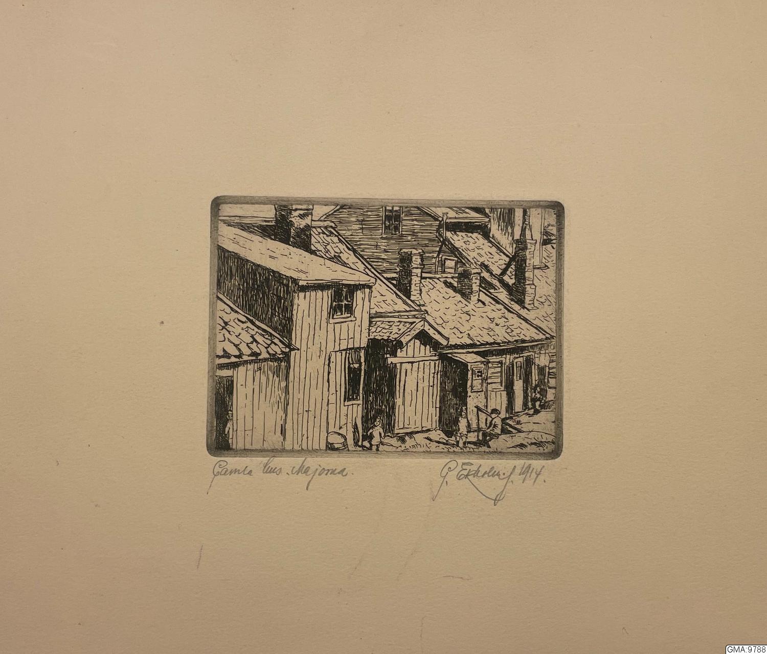 etsning 1915 av Gideon Ekholm (1886-1952) : motiv från Skepparegatan med husen Majornas 5 rote, nr 73 A och B.