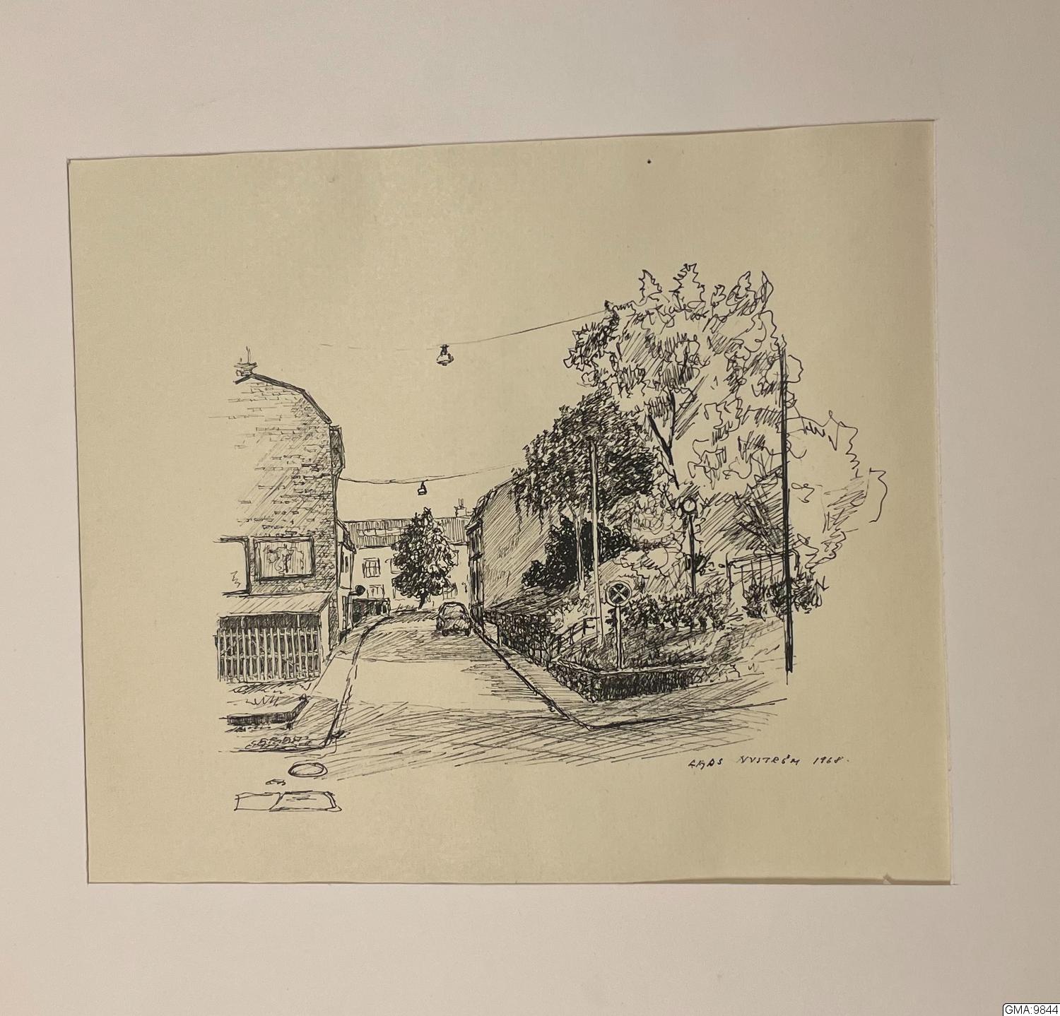 tuschteckning, signerad Lars Nyström 1968: motiv från Bergsgatan.