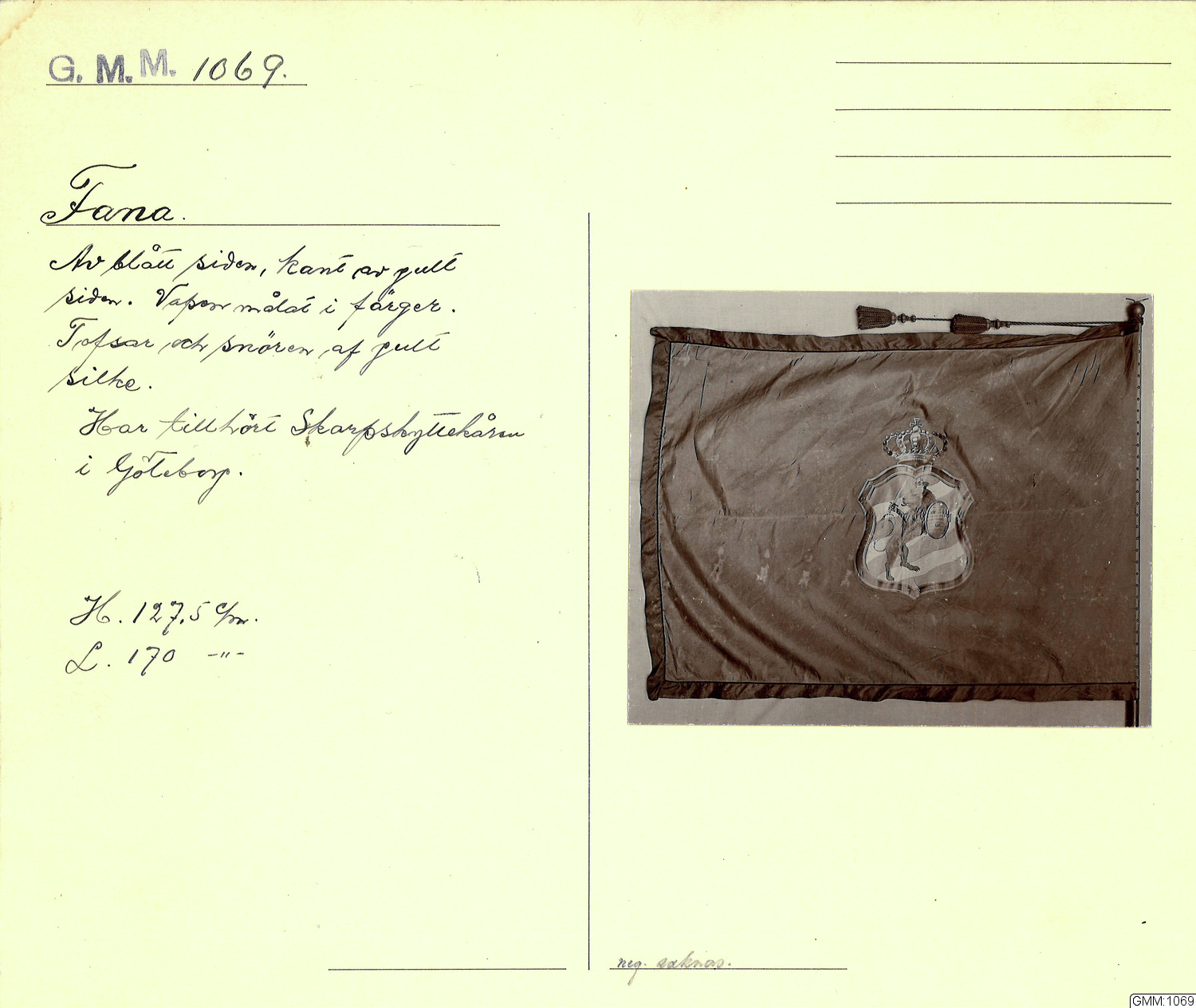 - Fana i blått siden med kant av gult siden. Vapen målat i färger. Tofsar och snören av gult silke.