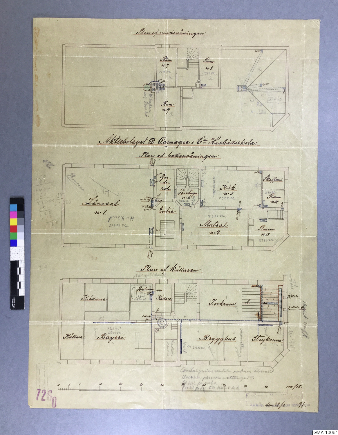 - Kockums Mek. Werkstad, Malmö den 29/1 1891: Aktiebolaget D. Carnegie & Co:s hushållsskola: planer av: källaren, bottenvåning, vindsvåning. Tusch på kalkerpapper.