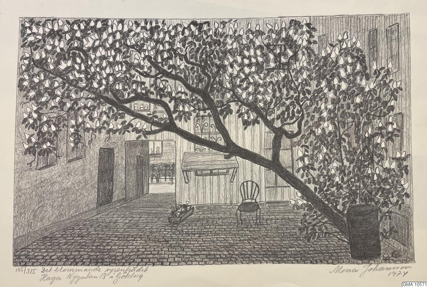 litografi Mona Johansson "Det blommande syrenträdet" Haga Nygata 13, Göteborg. 105/315.