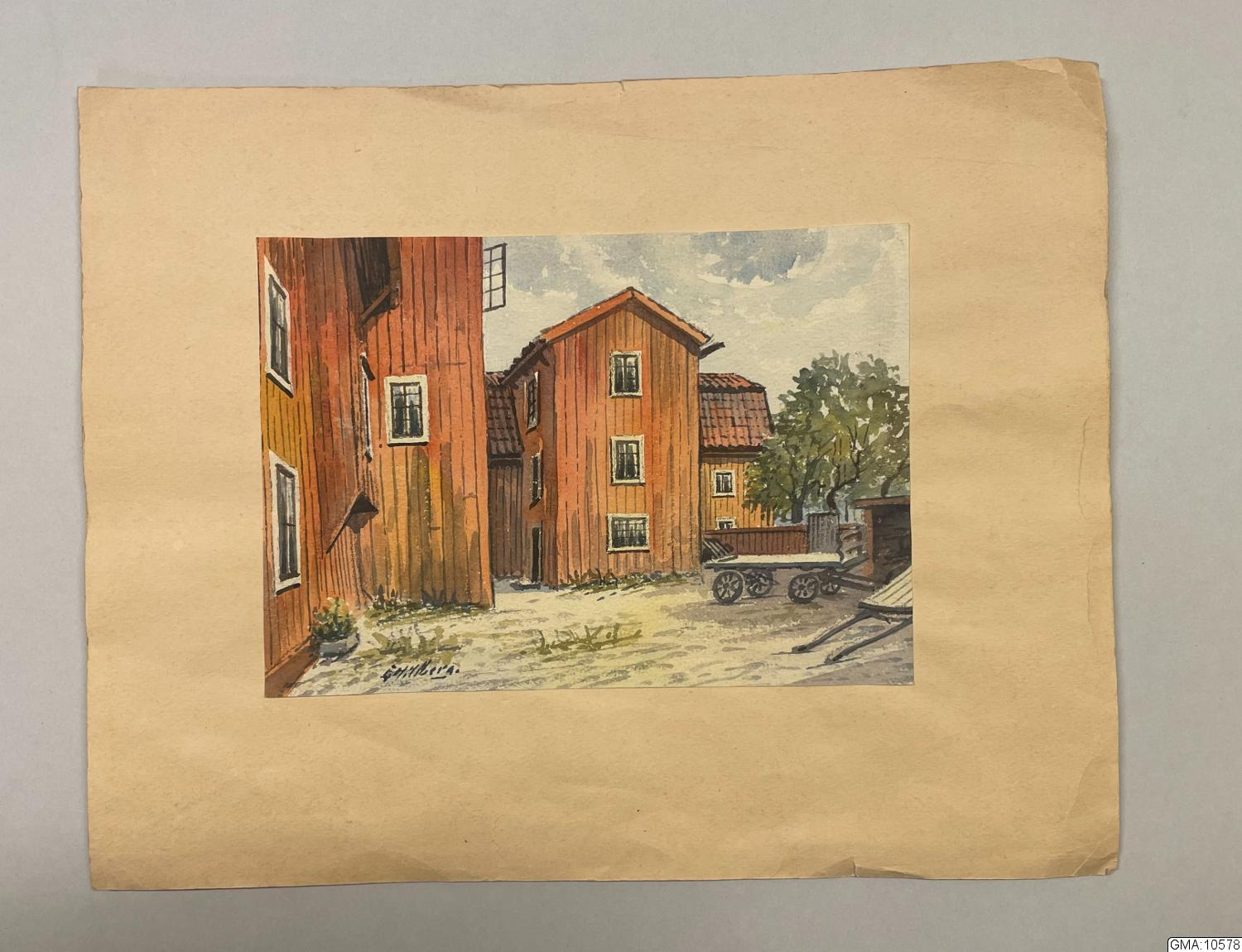 gårdsinteriör (Stampgatan 72-74 ?), Göteborg. Akvarell av E. Hillberg.