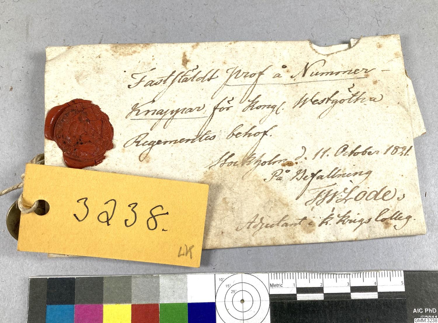- Modell på knapp. Fastställd prov å nummer-knappar för Kongl. Westgötha Regementes behov. Stockholm den 11 oktober 1821 T.W Lode Adjutant i Kungl. Krigs Collegium.