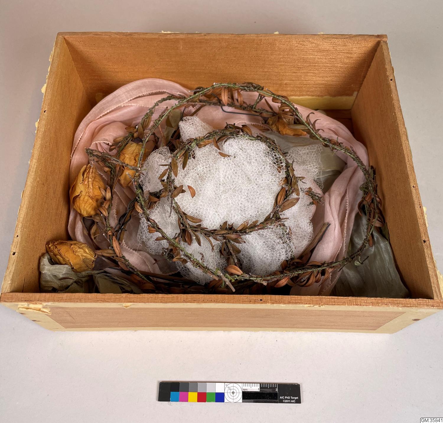 - Myrtenkrona i förvaringsask. Brudkrona med böjda skänklar av myrtenklädd ståltråd med vit tyllgarnering i mitten. Band och delar av brudbuketten i förvaringsaskens (cigarrask) botten.