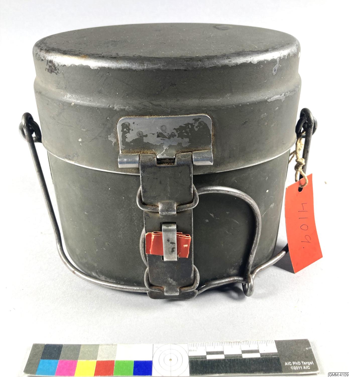 Kokkärl av aluminium med lock och krok. Till uniform GMM:4100 för "Den Danske brigade i Sverige" under 2:a världskriget åren 1943-1945