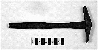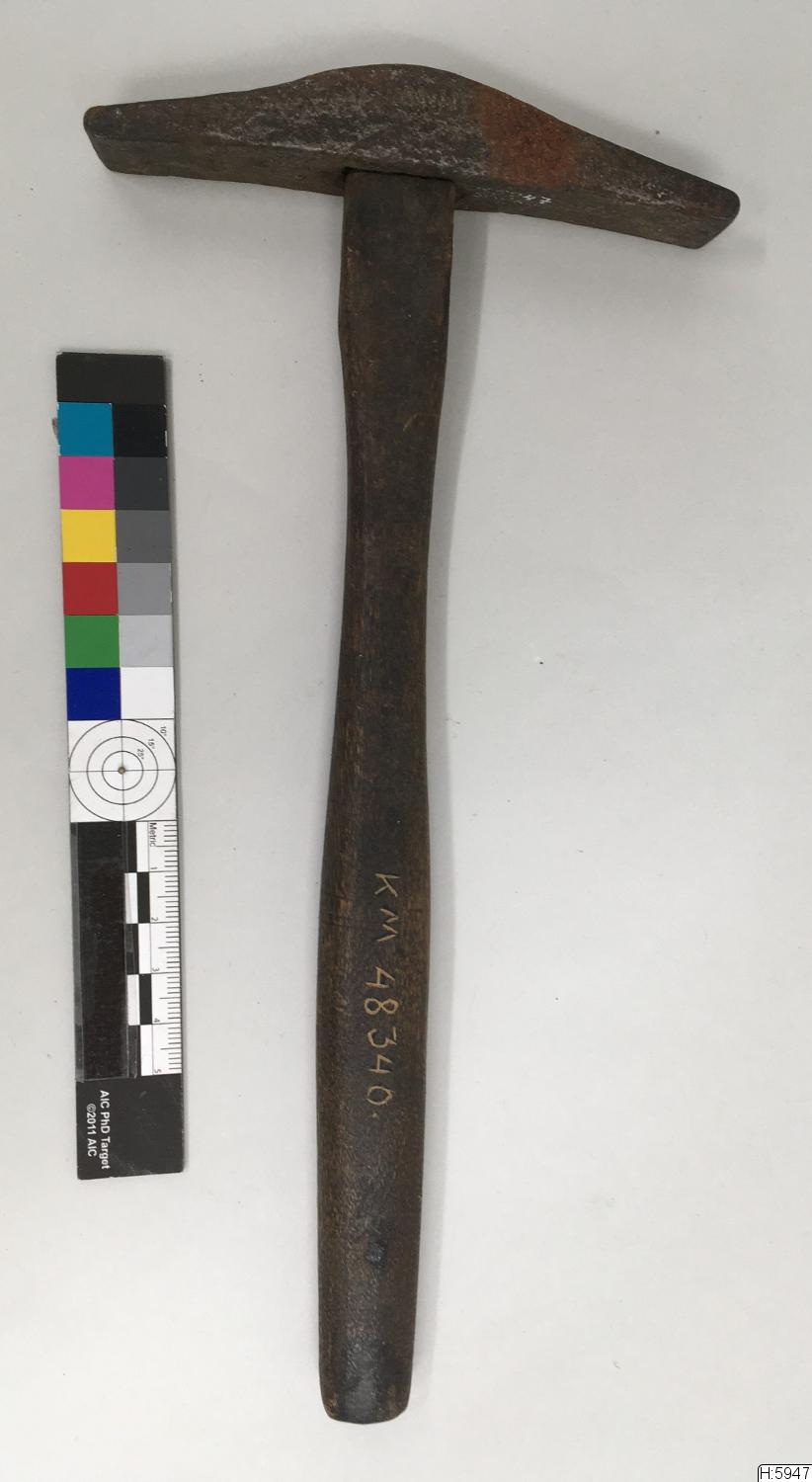 Fothammare med träskaft, guldsmedsverktyg. Tidigare deposition hos Kulturen, därför märkt på skaftet "KM 48. 340".; guldsmide