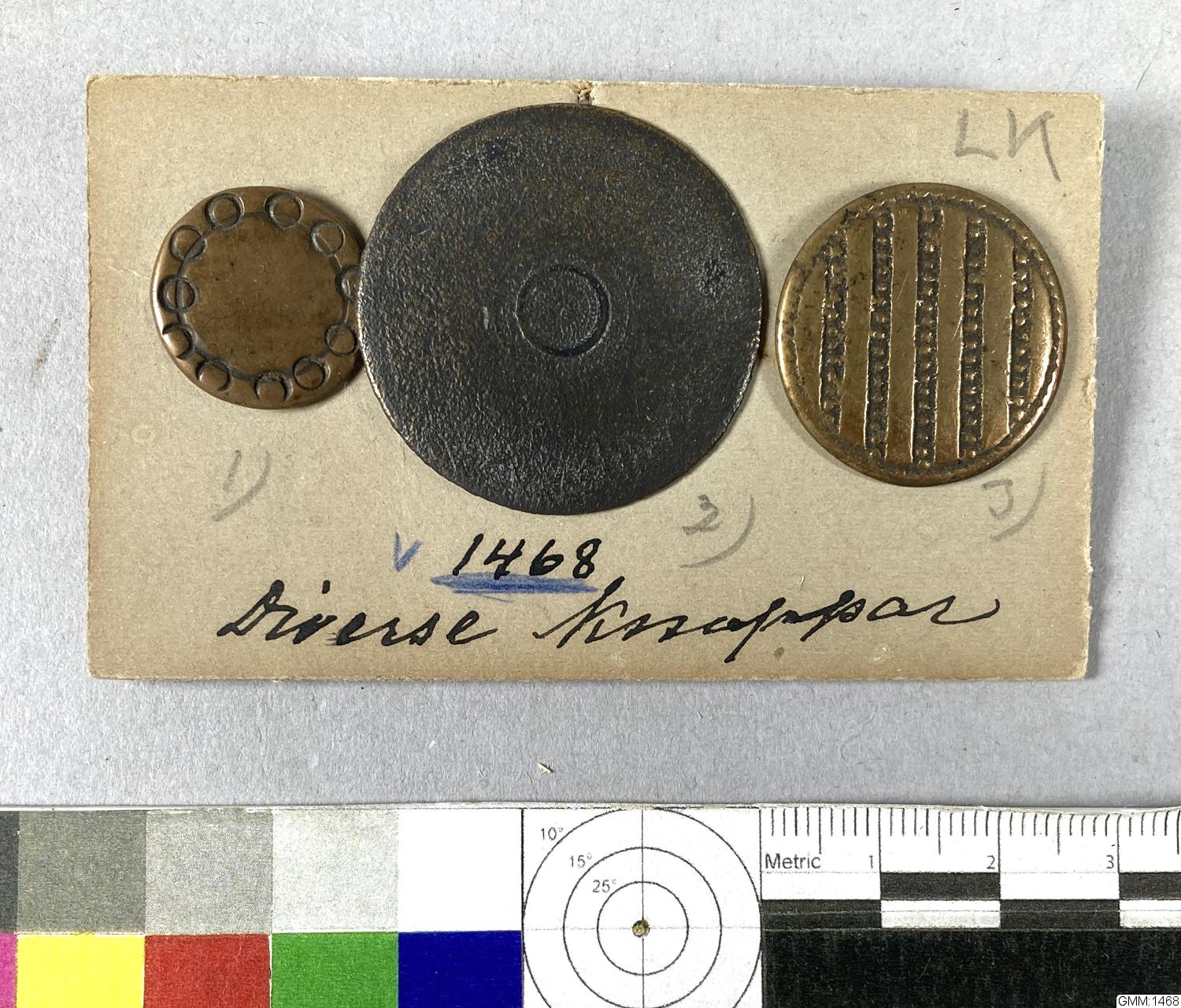 Tre stycken knappar, troligen till civil beklädnad. Monterade på pappskiva.