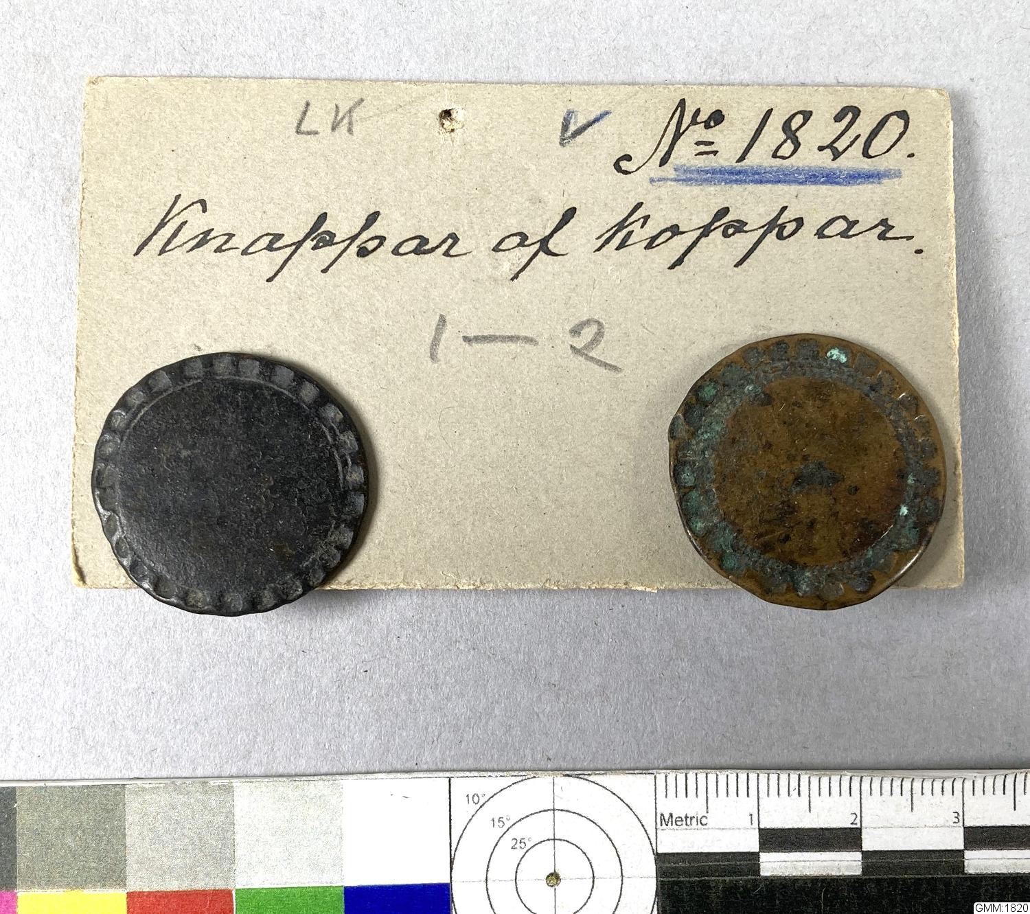 Två stycken knappar av koppar. Släta med ciselerad kant. Monterade på pappskiva.