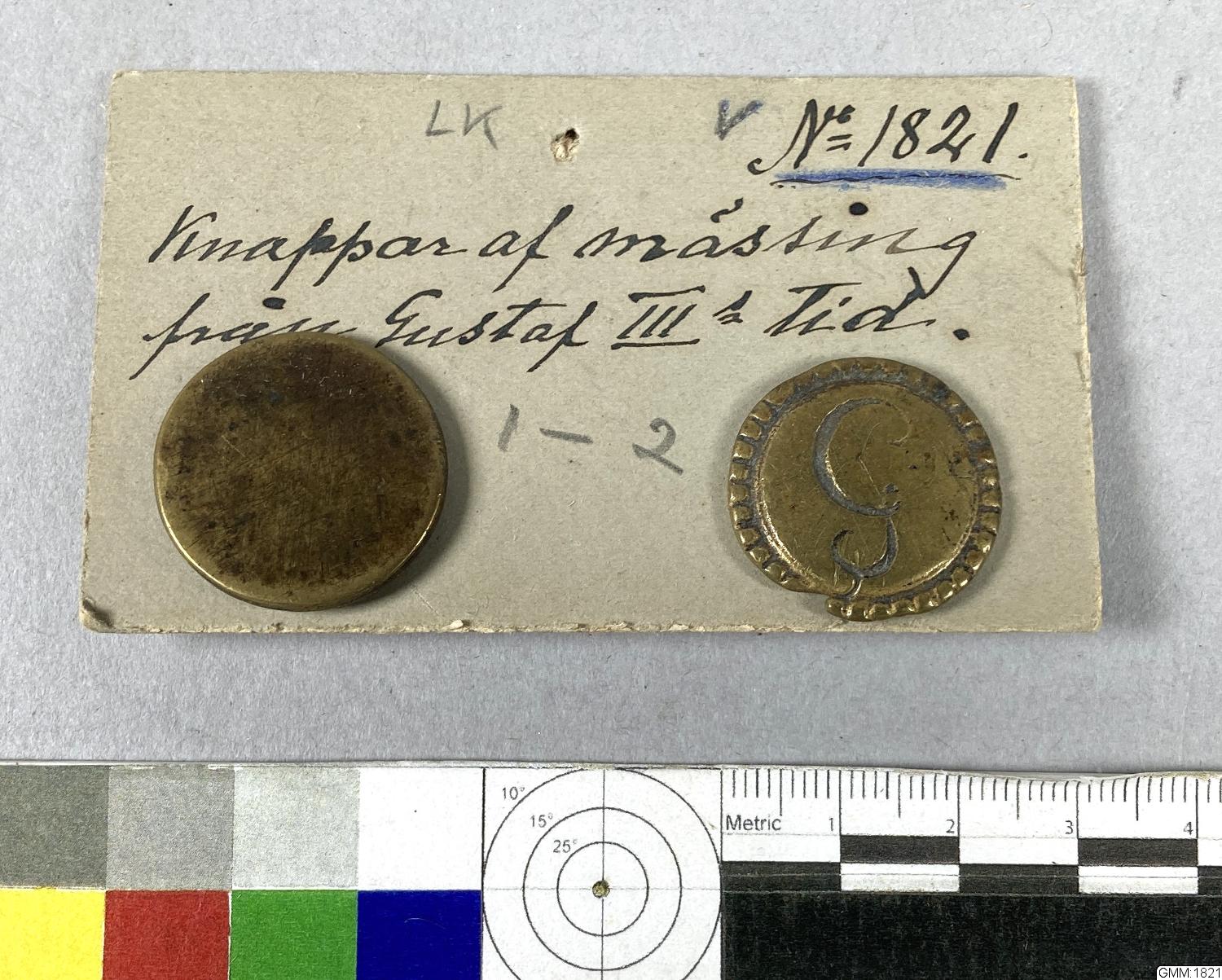 Två stycken knappar i mässing. Den första knappen helt slät, den andra något kupad med ciselerad kant samt ett "G" (Gustav III) i mitten. Monterade på pappskiva.