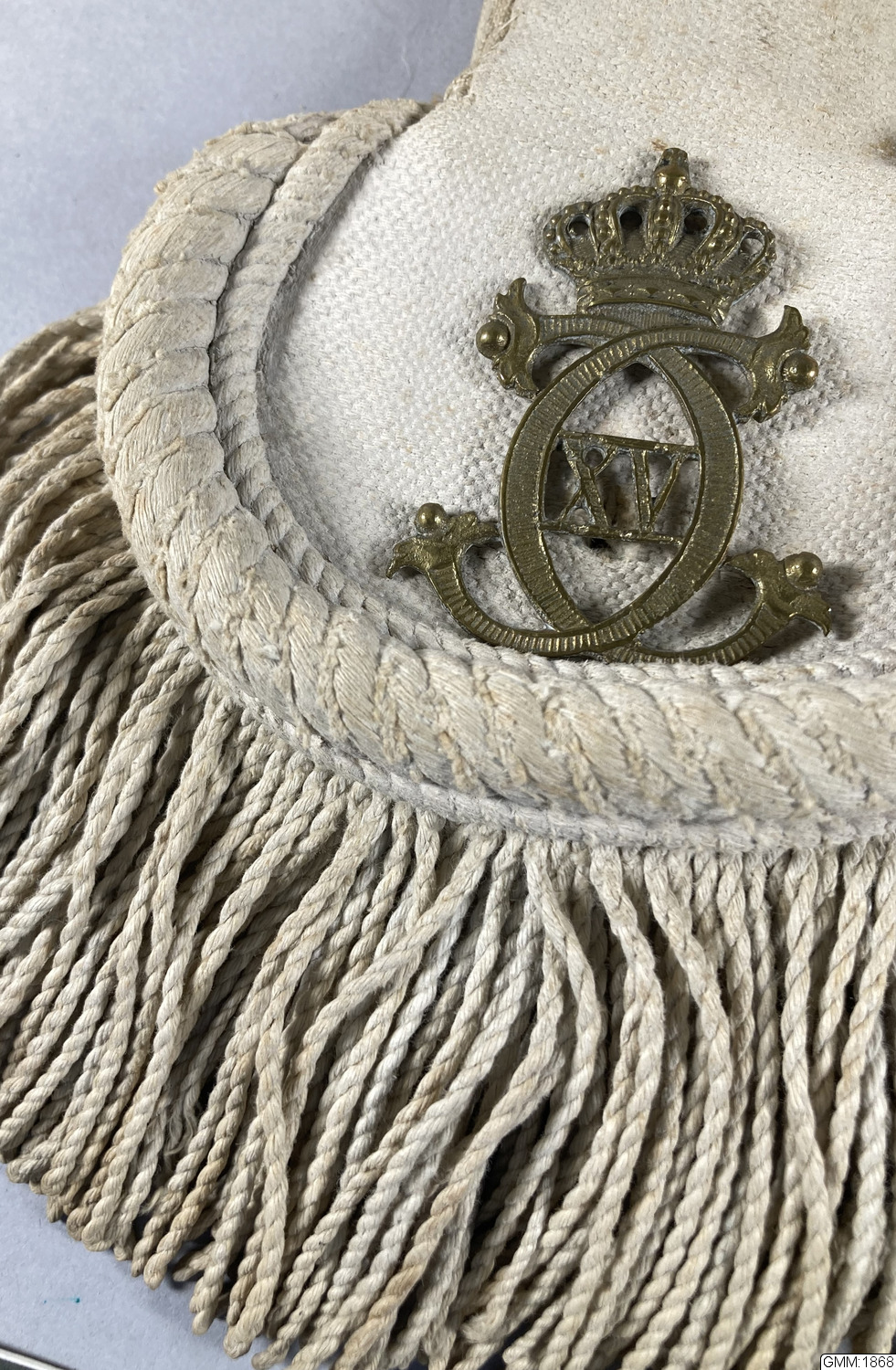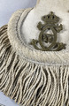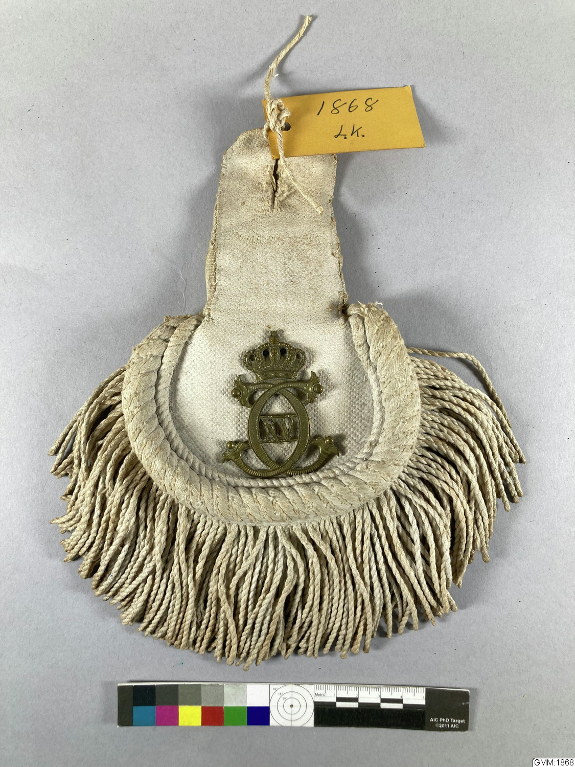 En epålett för manskap vid Svea och Göta Livgarde samt Livgarde till häst. Vita mattor och fransar. Karl XV:s krönta namnchiffer i gul metall. Modellexemplar.