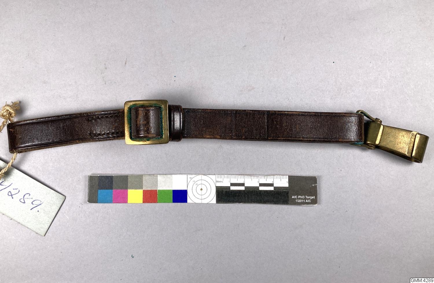 - För officer vid Kungliga flottan. Svartlackerat läder med beslag av mässing.