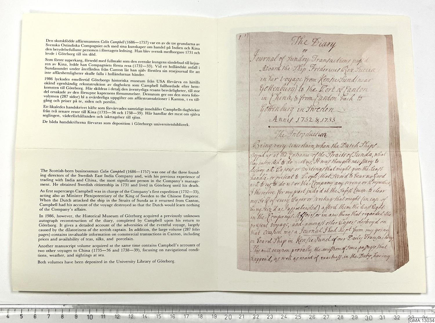dagbok förd av Colin Campbell år 1732 till 1733 på resa med skeppet Fredericus Rex Sueciae på resa mellan Göteborg och Kanton och under återresan till Göteborg.