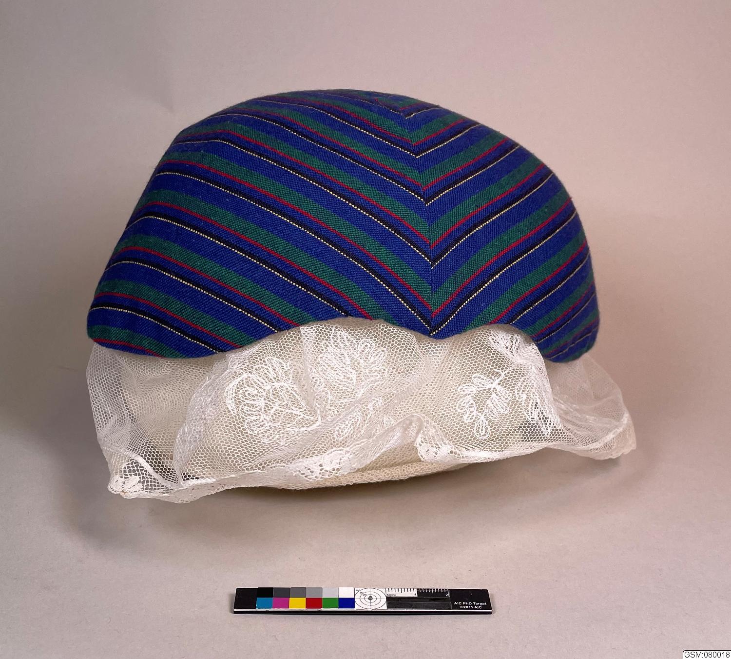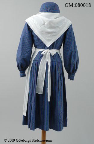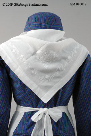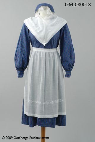 husmodersdräkt bestående av klänning av mönstervävt bomullstyg, förkläde och halskläde av tunn vit bomull med kedjesöms (eller möjligen tambursöms-) broderier i vitt samt en huvudbonad liknande en bindmössa, sydd av samma tyg som klänningen.