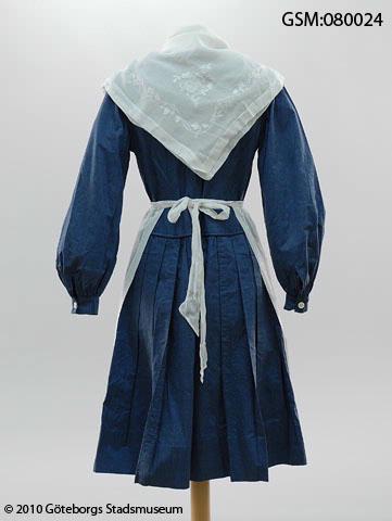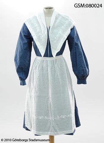 husmodersdräkt bestående av klänning av changeantvävt poplin av glansig mecericerad bomull, förkläde och halskläde av tunn vit bomull med kedjesöms (eller möjligen tambursöms-) broderier i vitt .Sannolikt har också en huvudbonad liknande en bindmössa, hört till dräkten men det är inte säkert om mössan som syddes till denna dräkt är bevarad eller ej och vilken av de bevarade mössorna GSM:080027-GSM:080030 som i så fall hör till dräkten.