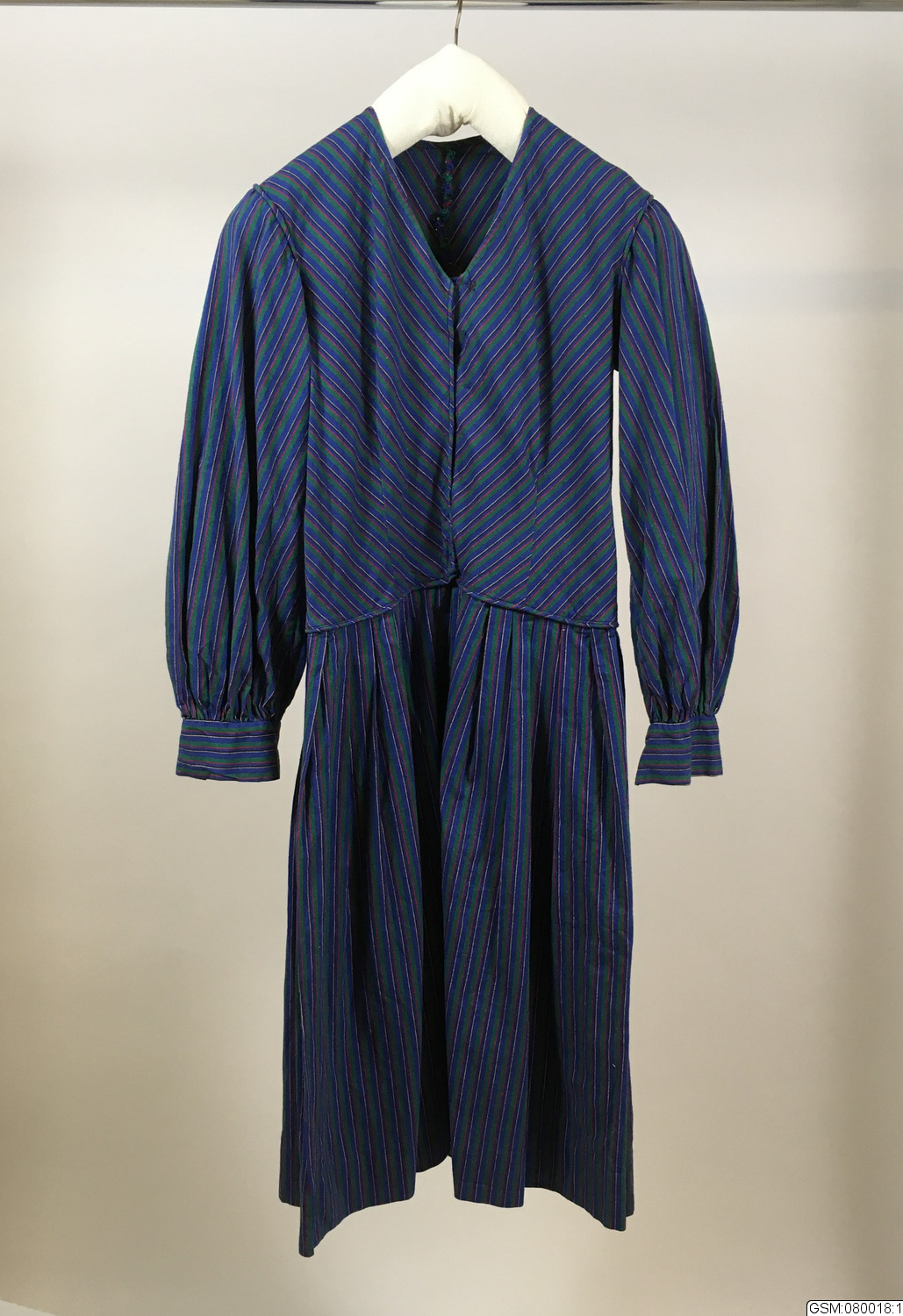 - Livets fram och bakstycke är skurna på diagonalen och har lodräta insnitt, också passpoallerna runt ärmhålen och i midjan är sneddskuren. Medan ärmarna och kjolen är rakt skurna. Kjolen är veckad mot livet utom mitt bak där den är rynkad. Klänningen knäpps med sex tryckknappar fram på livet och två par i vardera ärmmanschetten. Sömmarna är maskinsydda men sömsmånerna är kastade för hand.