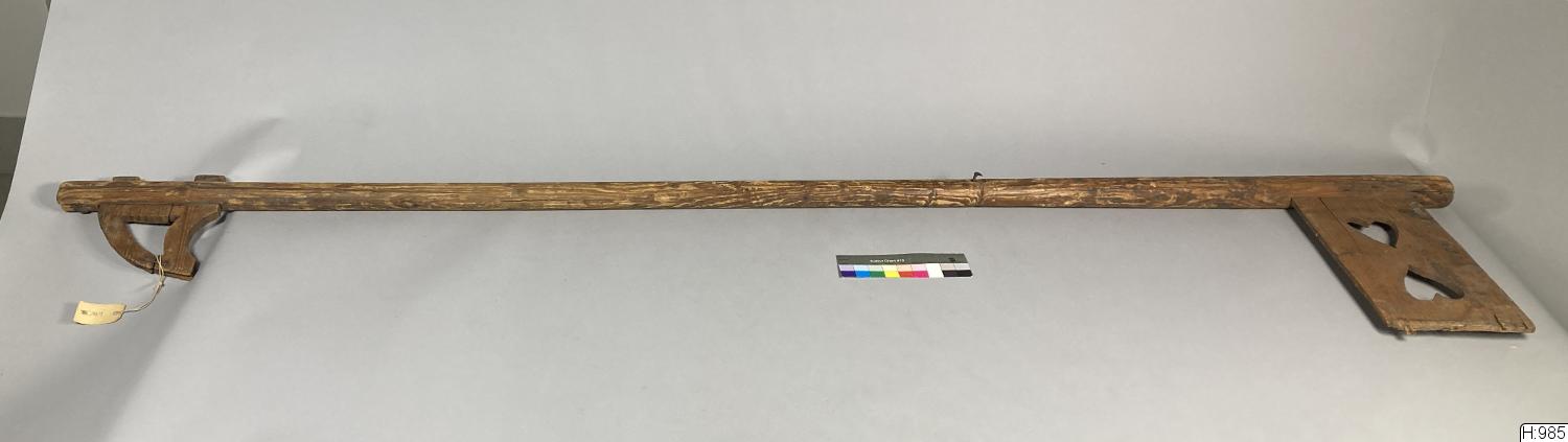 - På en lång furustång sitta i vardera änden en tunn träkloss. Båda två är genomskurna, den större med två hjärtan. Mellan båda klossarna är en sträng av fårtarm spänd. När håren eller ullen skulle faktas, förde faktaren bågen, som hängde i ett snöre i taket, med vänster hand och knäppte på faktsträngen med faktpinnen som han höll i högra handen. Ju finare hår man faktade desto finare faktsträngar använde man. Till ull behövdes det ganska grova faktsträngar. ( beskrivet på tillhörande katalogkort)