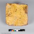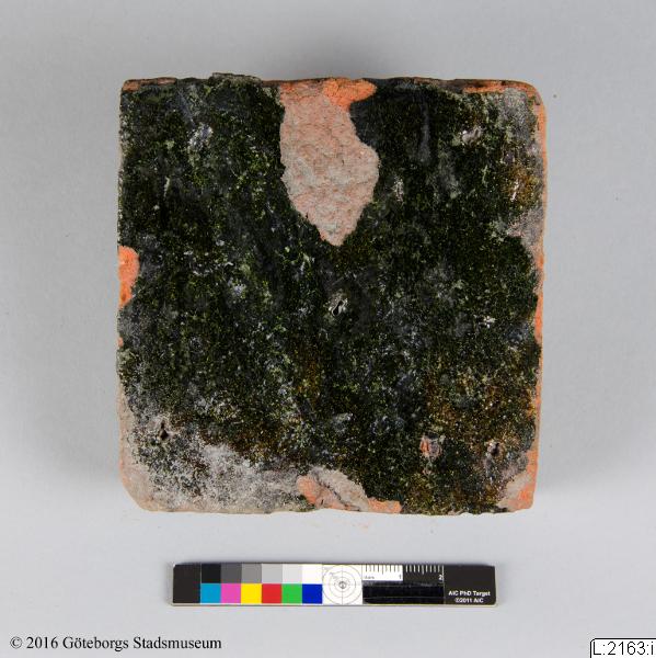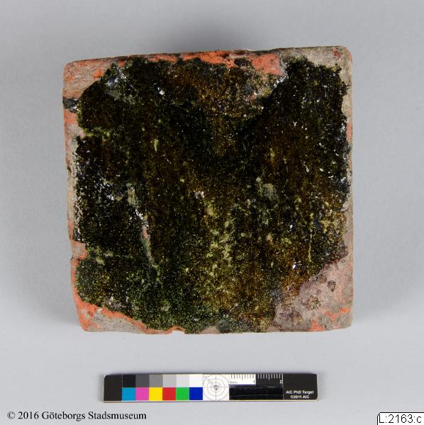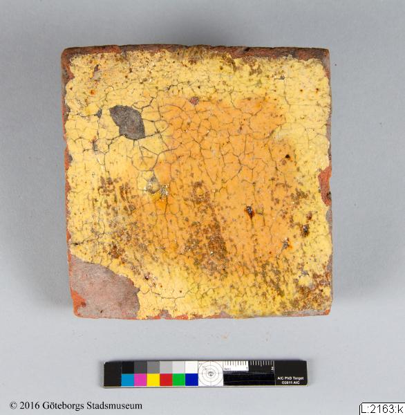 9 st golvplattor, glaserade, mindre. Gul (4 st.) grön (5 st.): 11 X 11 X 2,8 cm à 400 g. Rödlera.#Plattorna på bilden har beteckningarna a, c, e-g, i-l.