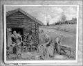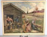 Material: papper, papp#Teknik: tryckt#Motiv:"Linets beredning", polykrom bild.#Målningen gjord av Urban Rejle #Fuktskadad, stötta kanter.#Text på baksidan se bilaga pärm.