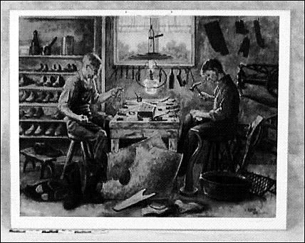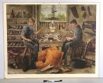 Material: papper, papp#Teknik: tryckt#Motiv:"Skomakare", polykrom bild.#Målningen gjord av Urban Rejle 1933#Fuktskadad.#