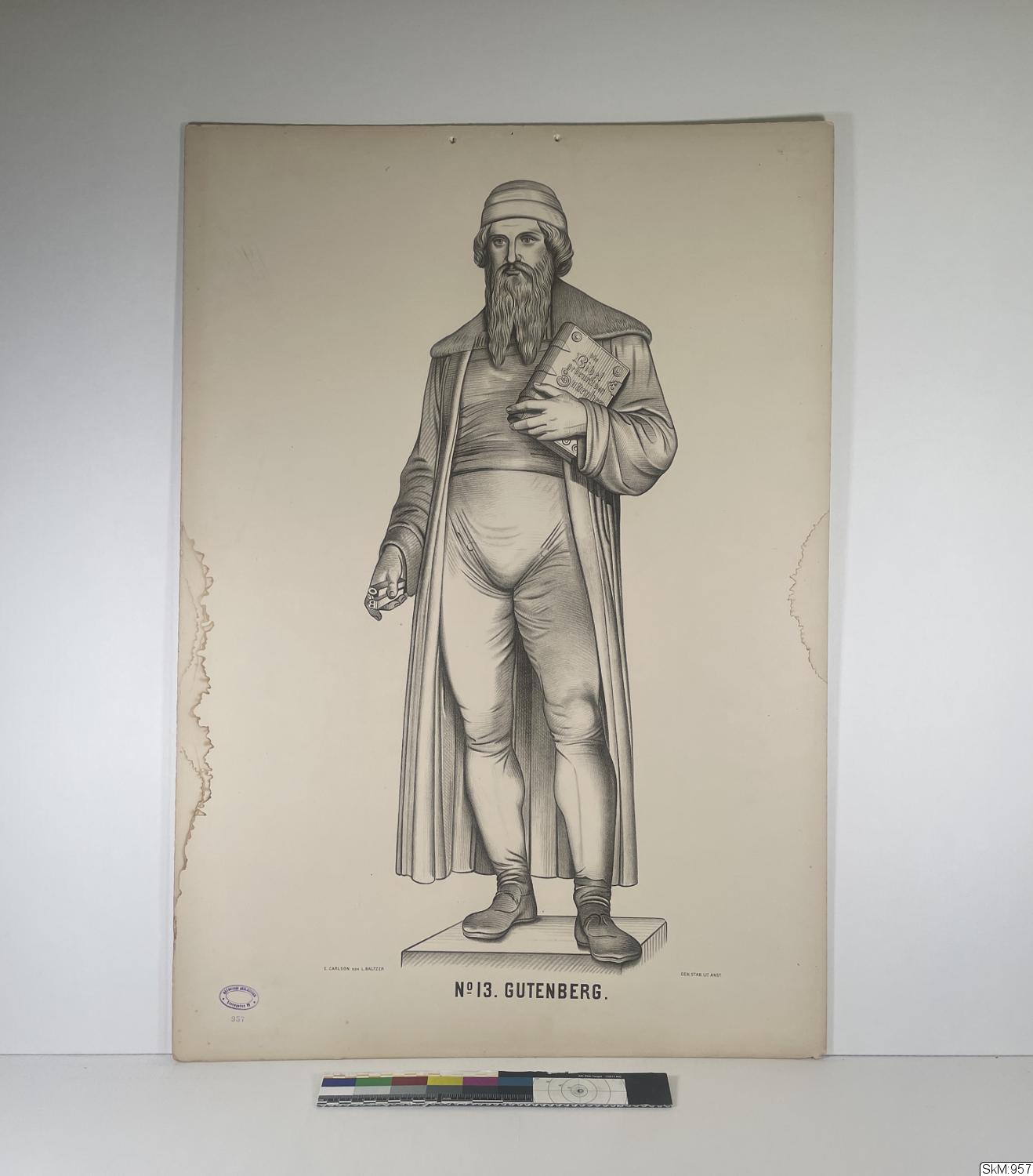 Tryckt hos Generalstabens Litografiska Anstalt.; Serien "Taflor ur allmänna historien" gavs ut av Norstedts år 1885. Upphovsmännen, Lauritz Baltzer och Ernst Carlson var kollegor på Göteborgs högre realläroverk. Illustrationerna är av teckningsläraren Baltzer, medan texten – inklusive det separata texthäftet – författades av historieläraren Carlson. Texthäftet berättar historiska fakta om det som syns på bilden. Tanken var att läraren skulle kunna använda det som underlag när planschen visades.