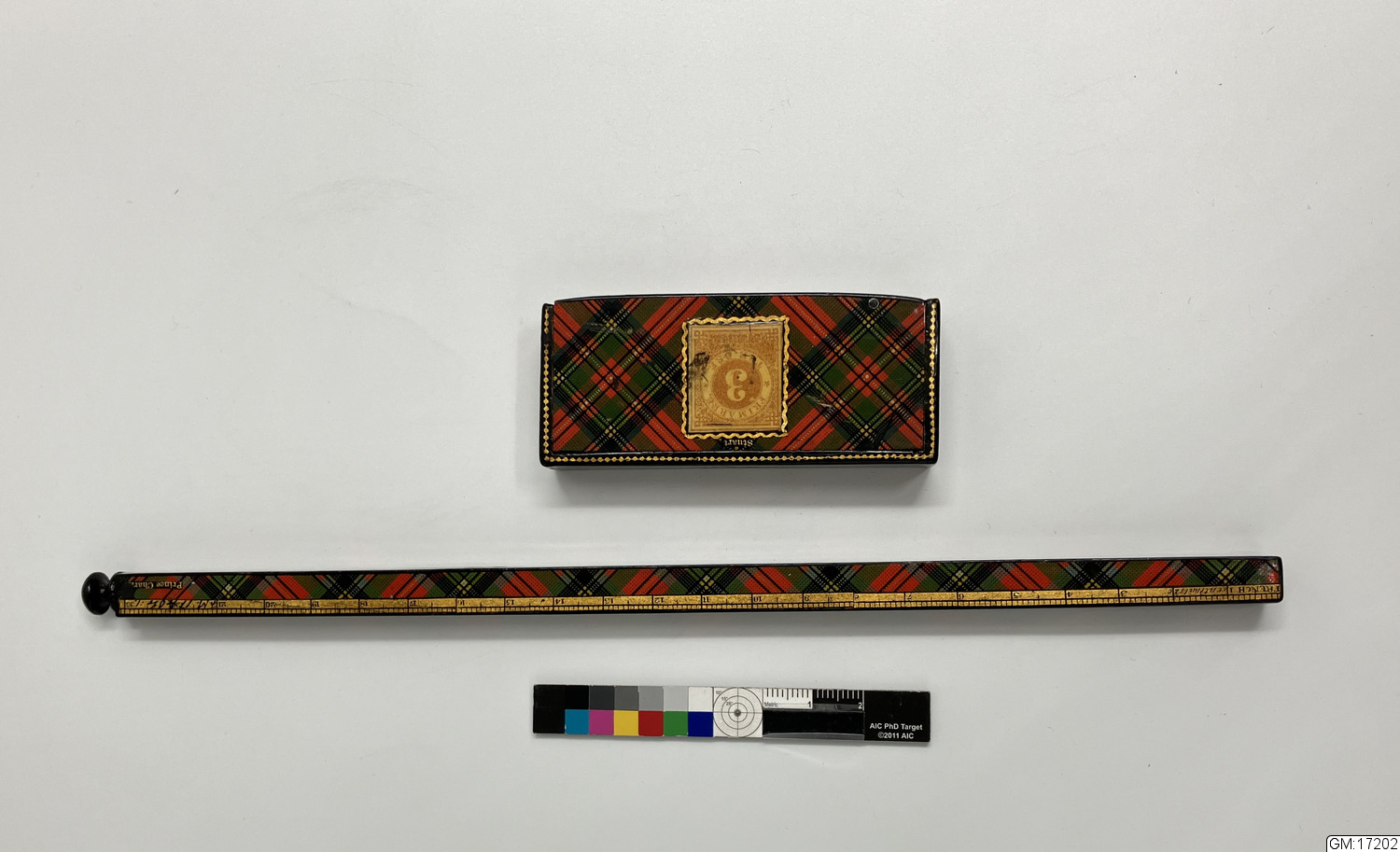 - Blyertspenna med träfodral och frimärksask med skotskrutigt mönster.