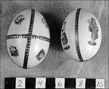 Två hönsägg, ligger i en pappask med marmorering och röda kanter, nötta.
