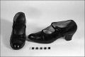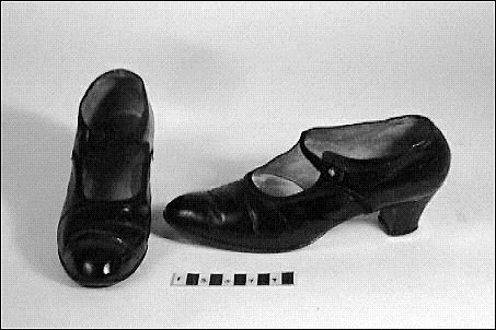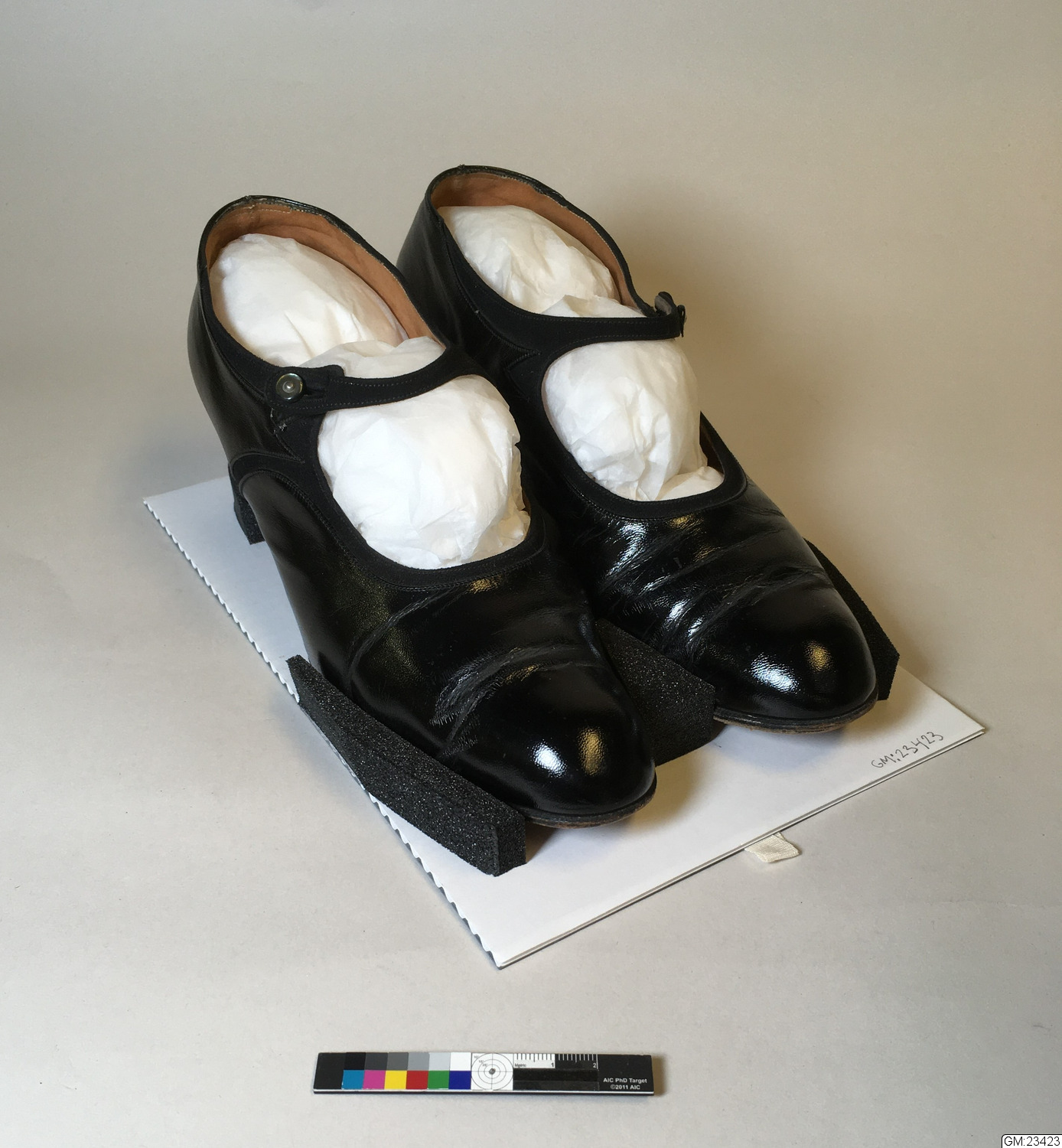Från katalogkort: Damskor; svart knäppsko av lackat skinn. Infällningar av maskinsöm. 5 cm hög klack. Fodrad med dels skinn, dels lärft. Firmastämpel: Nordlöfs Göteborg. Sulans längd 13 cm.