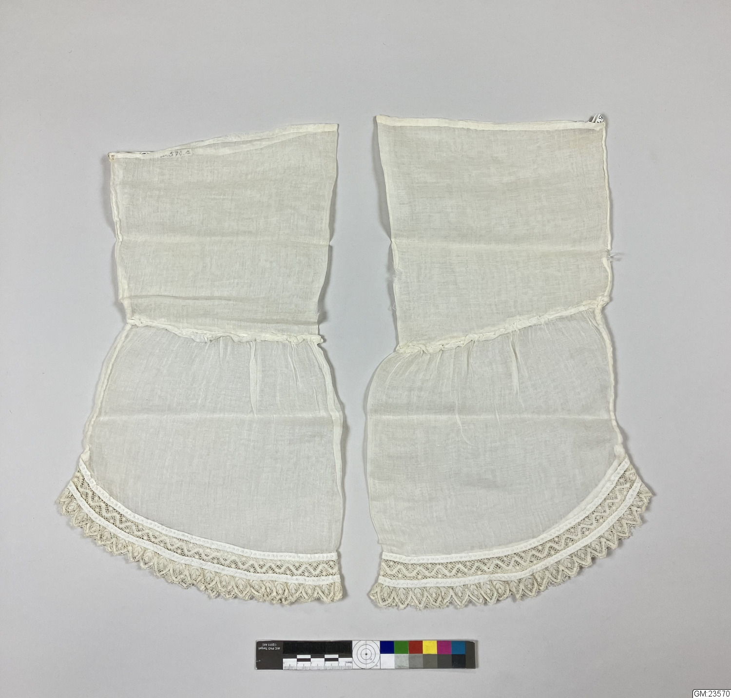 ett par underärmar av vit tunn bomullsväv garnerad med ett 15-20 cm brett krus med rynkhuvud, garnerad med spets.