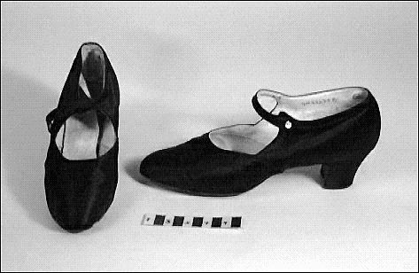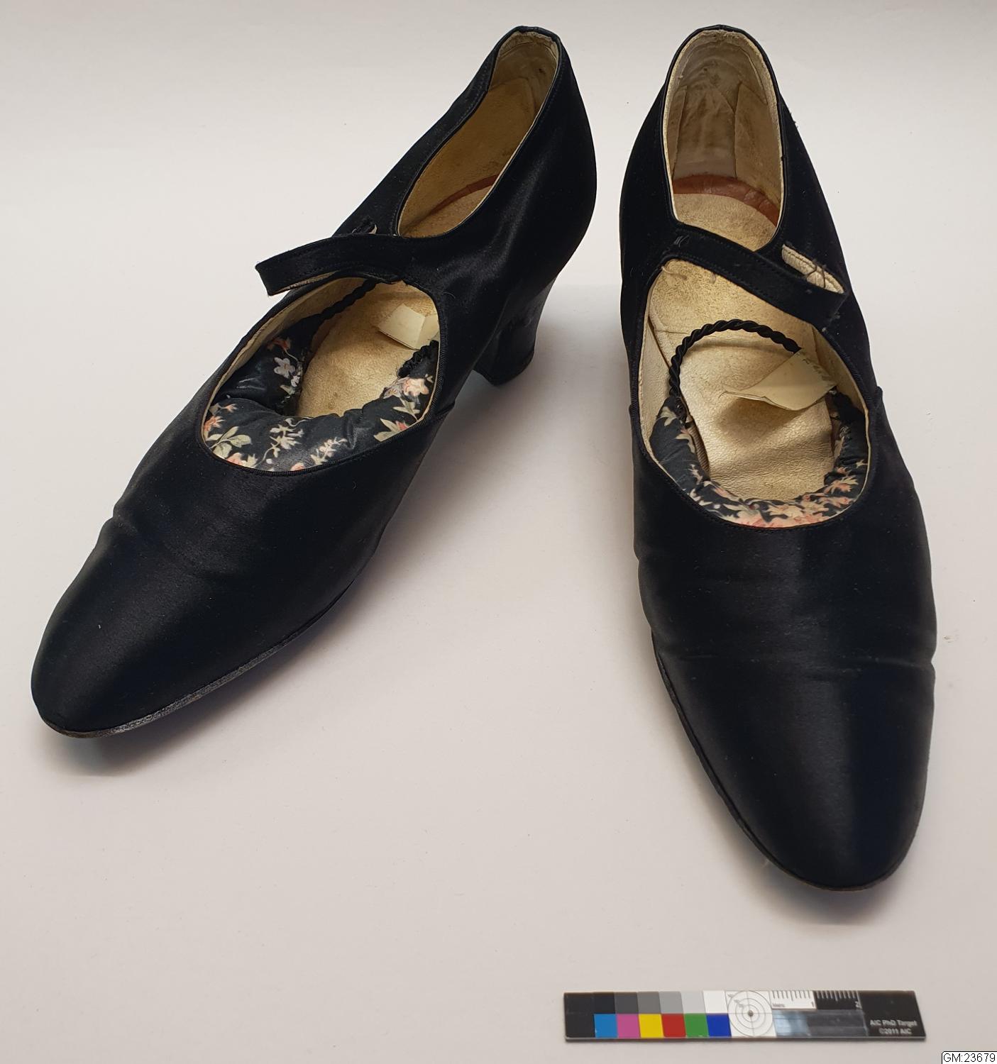 damsko av svart atlas. Halvhög klack. Rem runt vristen.