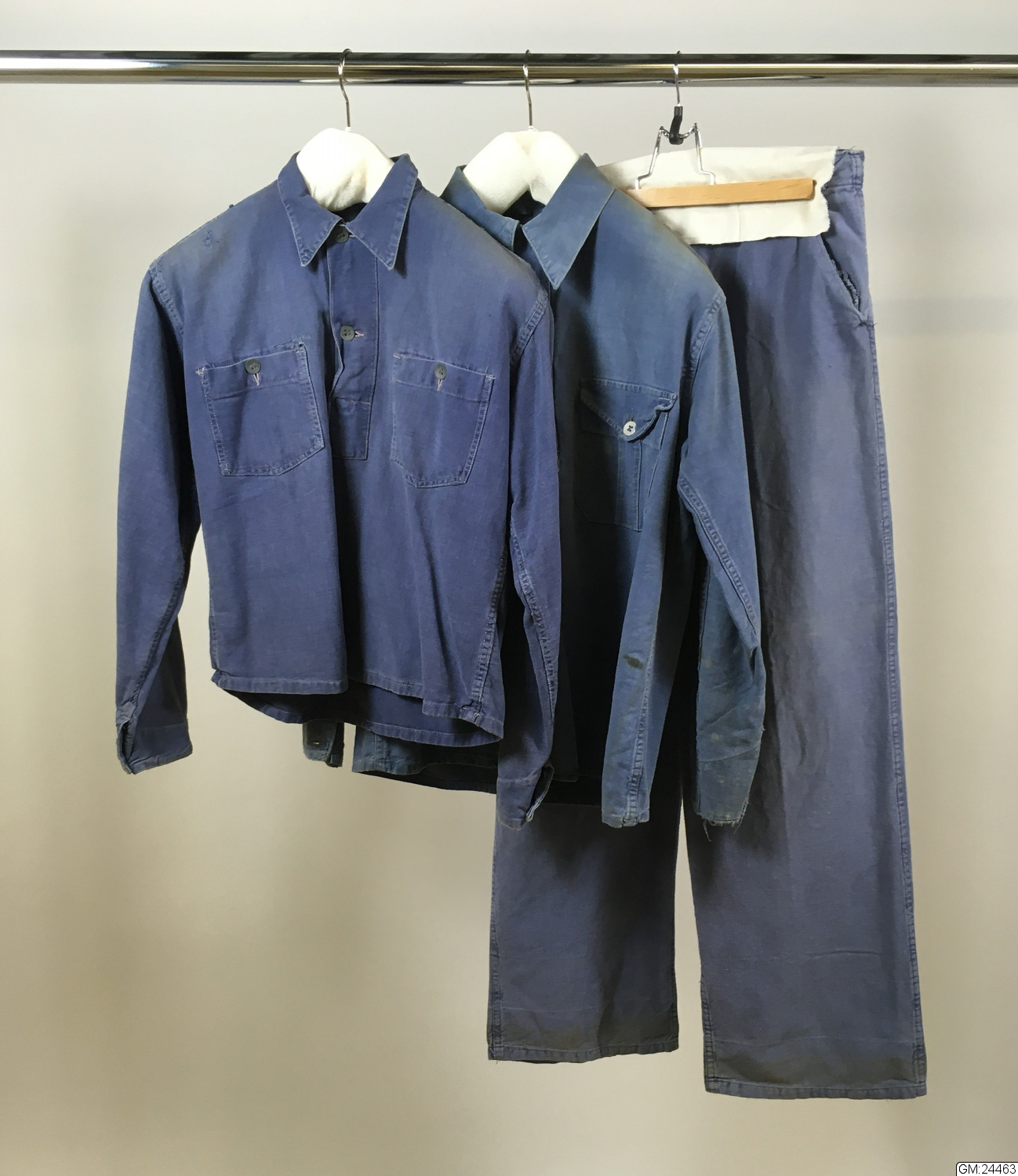 Arbetskläder bestående av två skjortor och ett par byxor i blå bomullstwill.