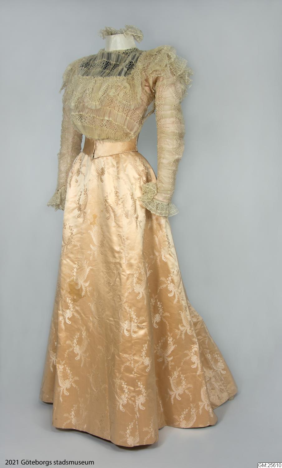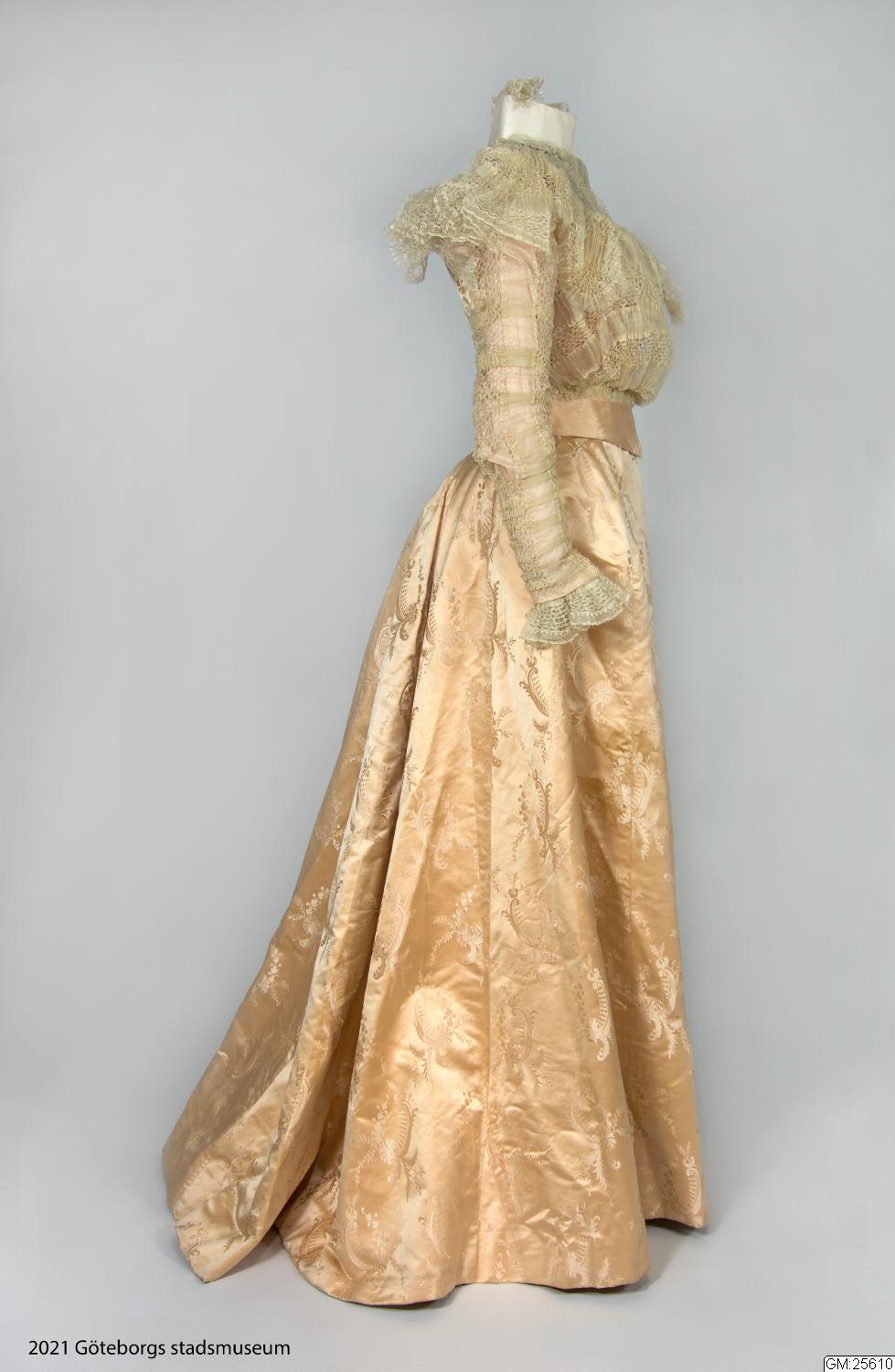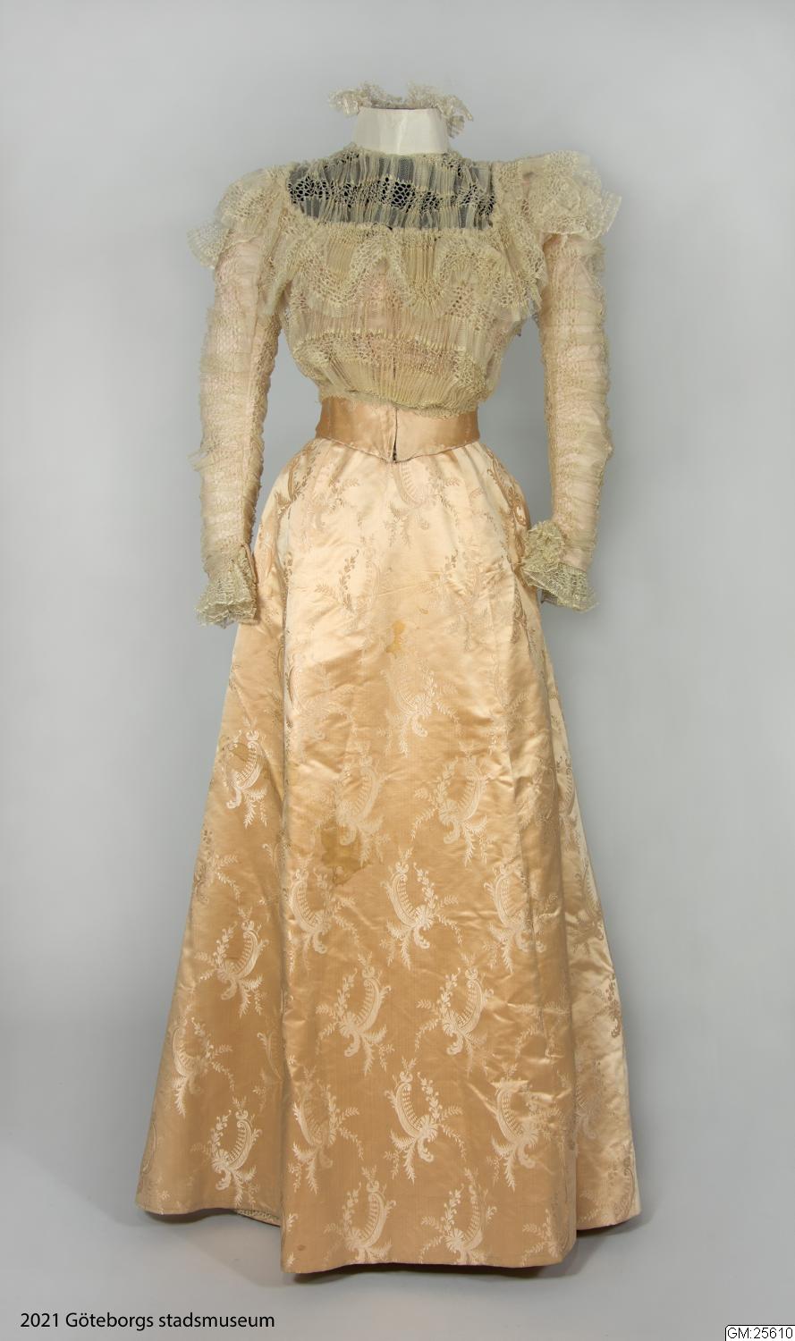 Från katalogkort: Klänning i två delar: Liv och kjol i ljust laxrosa blommönstrat sidenatlas. a) Livet är figursytt med 11 fjädrar. Fyrkantig ringning. Snibb nedtill mitt fram. Framstyckena av omönstrad rosa satängsiden. Ståndkrage, 6 cm bred, i cremevit taft med styvnad. Foder av cremevitt moirémönstrad bomullsatäng. Framstycken, ringning, krage och ärmar täckta med plisserad cremevit tyllspets. Knäppning fram med hyskor och hakar. Lång ärm. Längd 41 cm. b) Kjol med turnyr (sic!), skuren i 6 klockvåder. Sprund mitt bak med några rynkor omkring. Smal linning i samma tyg. En ficka infälld i söm i ena sidan. Fodrad med gas, lärft samt yllemuslin i vitt. Längs nederkantens insida 16 cm bred cremefärgad vit tyllspets.