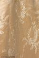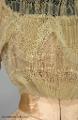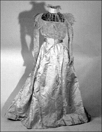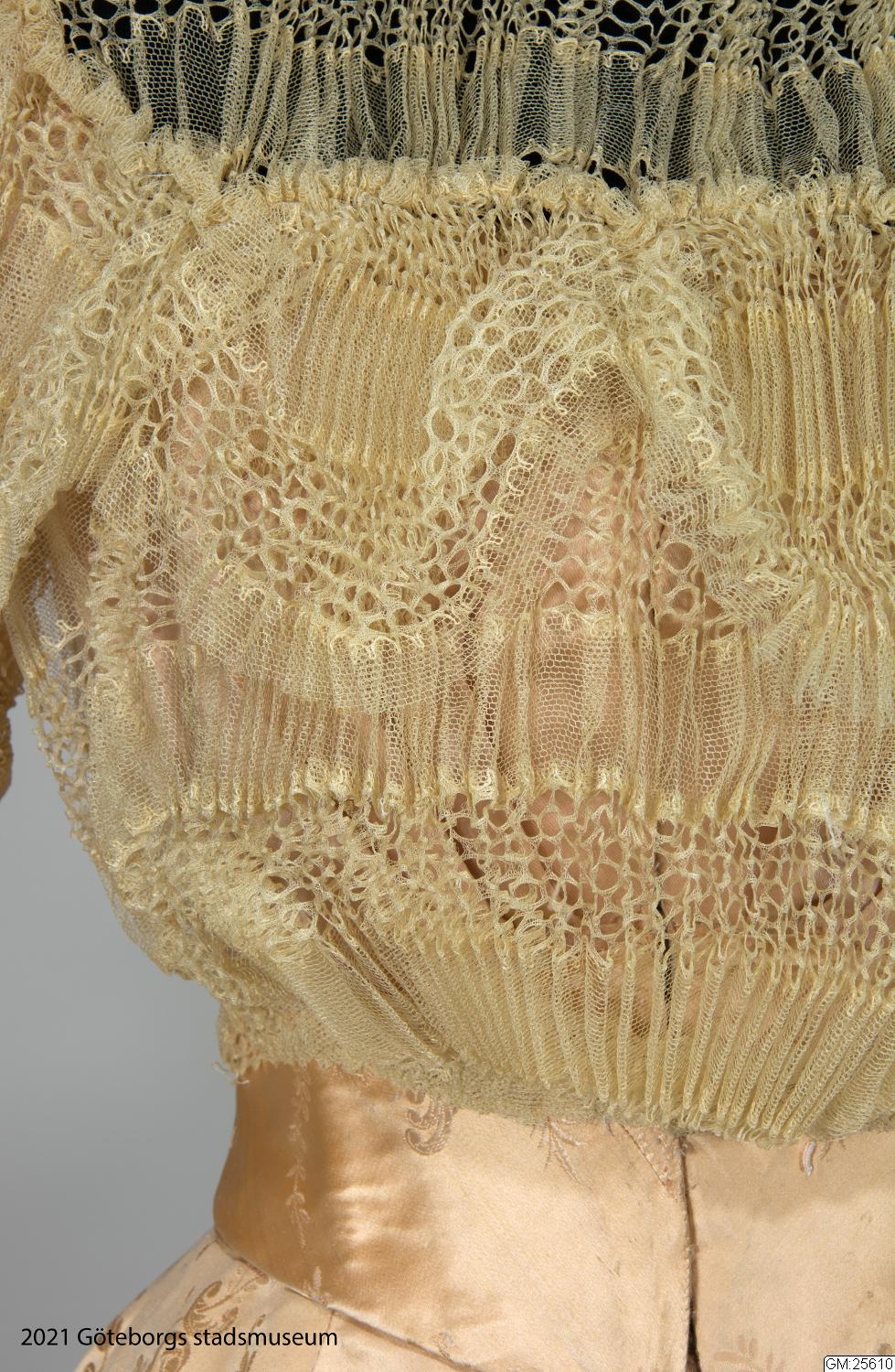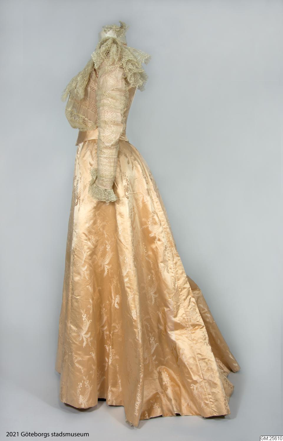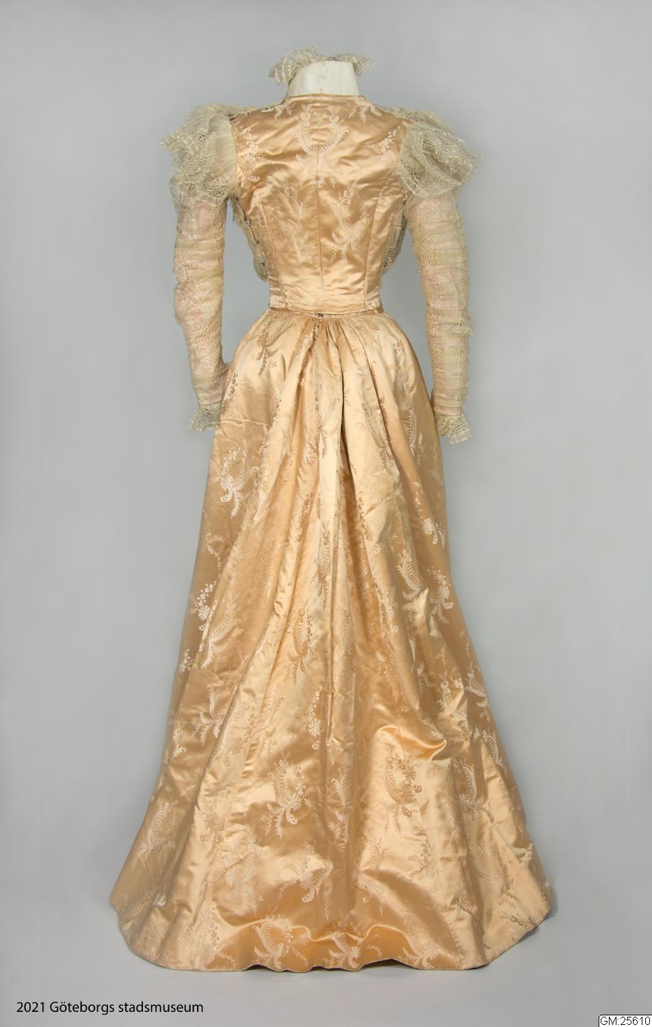 Från katalogkort: Klänning i två delar: Liv och kjol i ljust laxrosa blommönstrat sidenatlas. a) Livet är figursytt med 11 fjädrar. Fyrkantig ringning. Snibb nedtill mitt fram. Framstyckena av omönstrad rosa satängsiden. Ståndkrage, 6 cm bred, i cremevit taft med styvnad. Foder av cremevitt moirémönstrad bomullsatäng. Framstycken, ringning, krage och ärmar täckta med plisserad cremevit tyllspets. Knäppning fram med hyskor och hakar. Lång ärm. Längd 41 cm. b) Kjol med turnyr (sic!), skuren i 6 klockvåder. Sprund mitt bak med några rynkor omkring. Smal linning i samma tyg. En ficka infälld i söm i ena sidan. Fodrad med gas, lärft samt yllemuslin i vitt. Längs nederkantens insida 16 cm bred cremefärgad vit tyllspets.