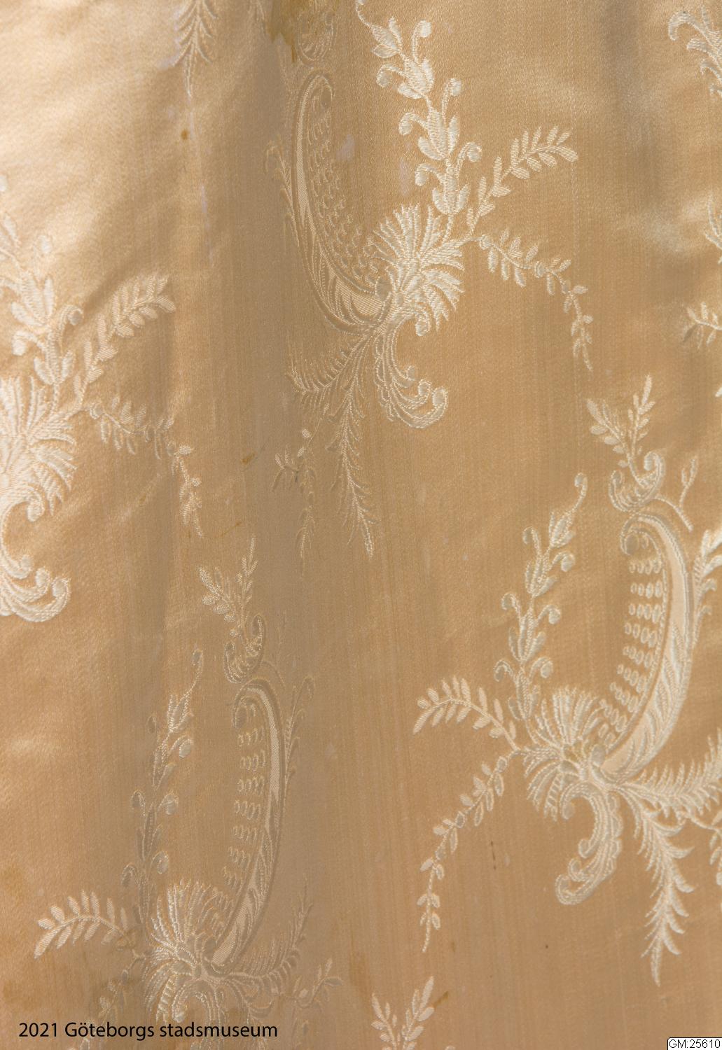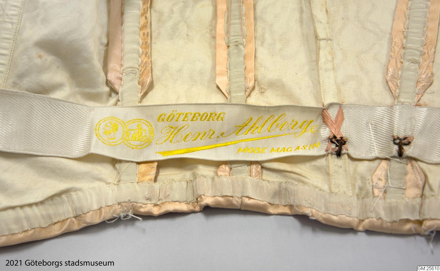 Midjebanden försedda med firmamärke Henr. Ahlberg Modemagasin, Göteborg. Längd fram: 108 cm, längd bak: 122 cm, vidd: 208 cm. Tillhörande skor se GM:25693
