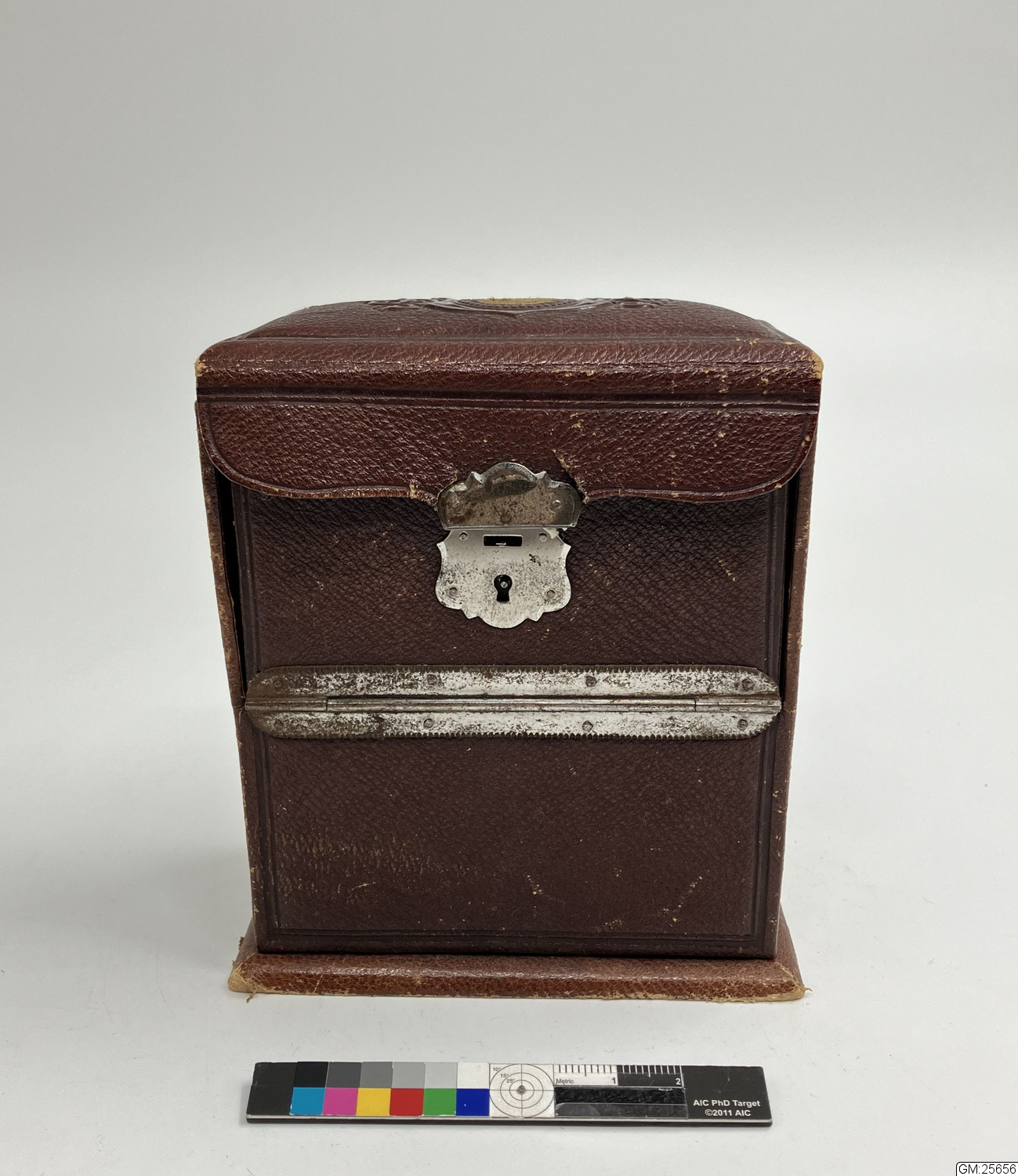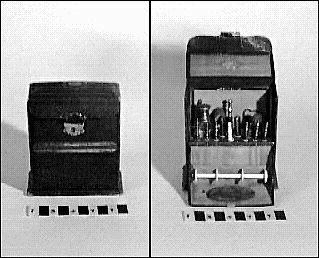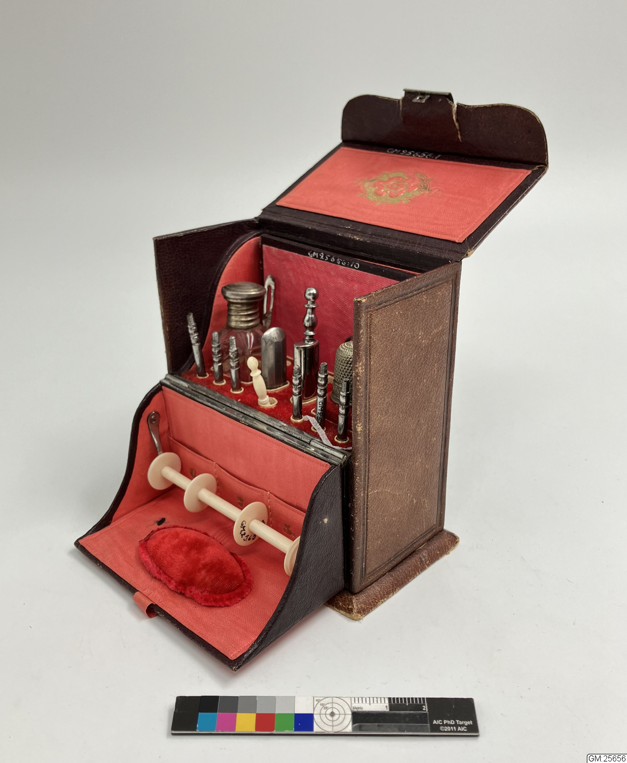 - "Ladys companion" med syredskap m.m. av papp och trä, klädd med brun pergammoid, fodrat med röd moiré och sammet. Inkluderar 2/fingerborg 3/trädningsnål 4/pryl 5/ nålhus 6/virknålar med separat skaft 7/korkskruv 8/ flacon 9/ trådrulle 10/spegel.