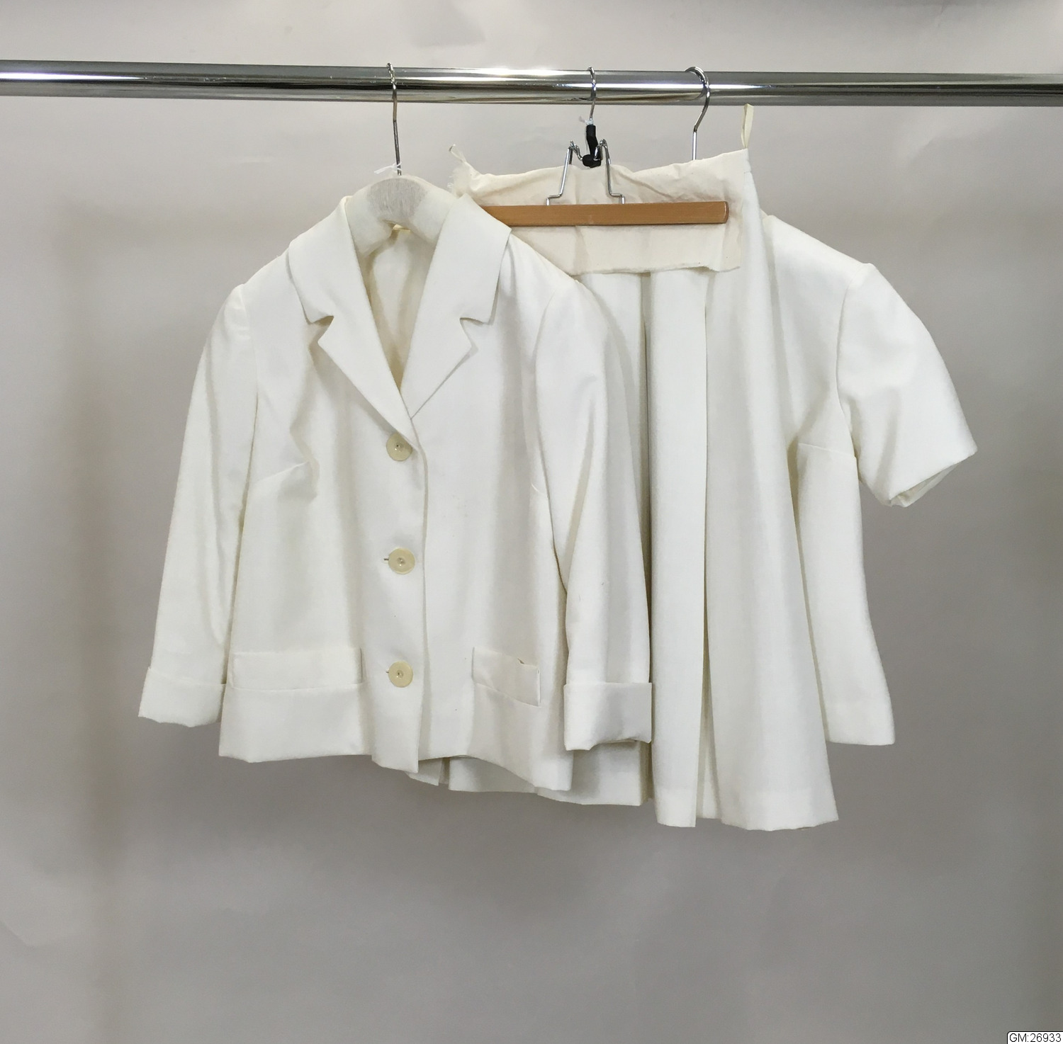 Damdräkt i tre delar bestående av jacka, kjol och kortärmad blus.