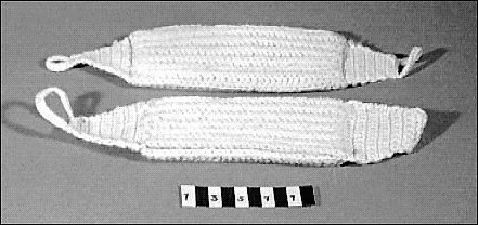 Dambindor av vitt bomullsgarn, stickad-resårstickning. Öppna i ena sidan. Hakar i ändarna.