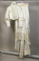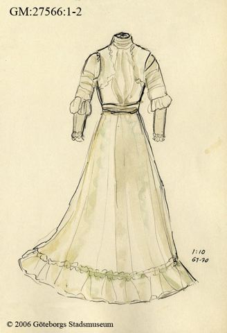 Rynkad kjol fäst vid midjan, knäppt bak. Kjolen släpande bak. Volang nedtill.