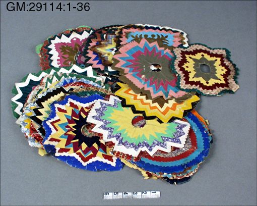 - Julgransprydnader av glanspapper. Runda, hjärtformade m.m, blad av plattor med hål i mitten att trä på julgranens grenar. Material: glanspapper klippta i varierande former och färger i många lager. För enskilda detaljer se respektive undernummer.