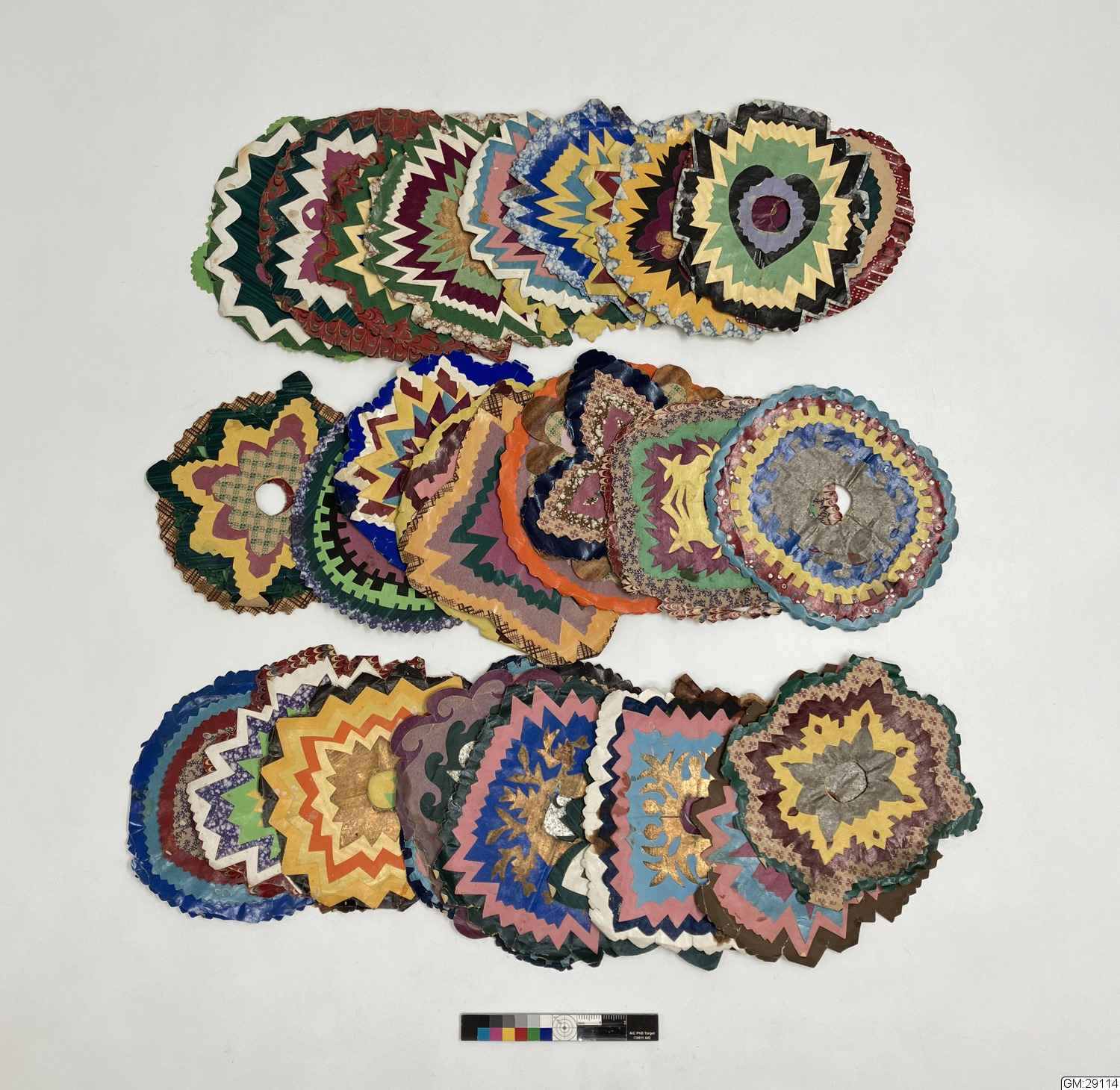 - Julgransprydnader av glanspapper. Runda, hjärtformade m.m, blad av plattor med hål i mitten att trä på julgranens grenar. Material: glanspapper klippta i varierande former och färger i många lager. För enskilda detaljer se respektive undernummer.