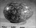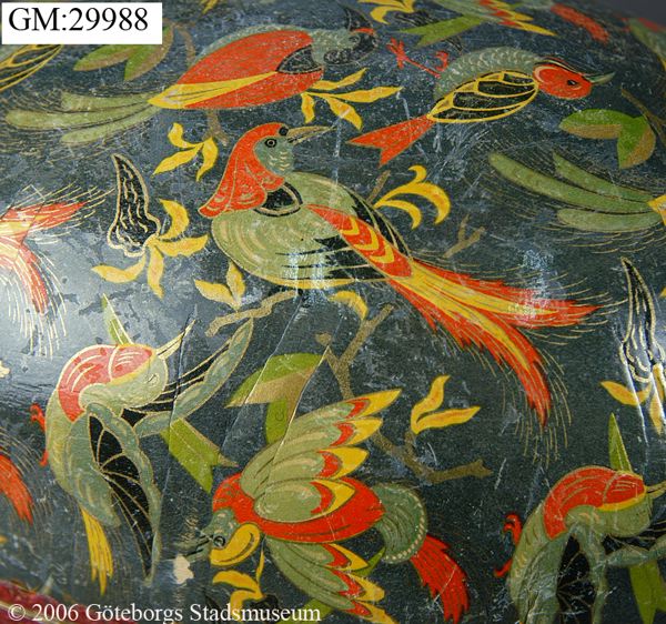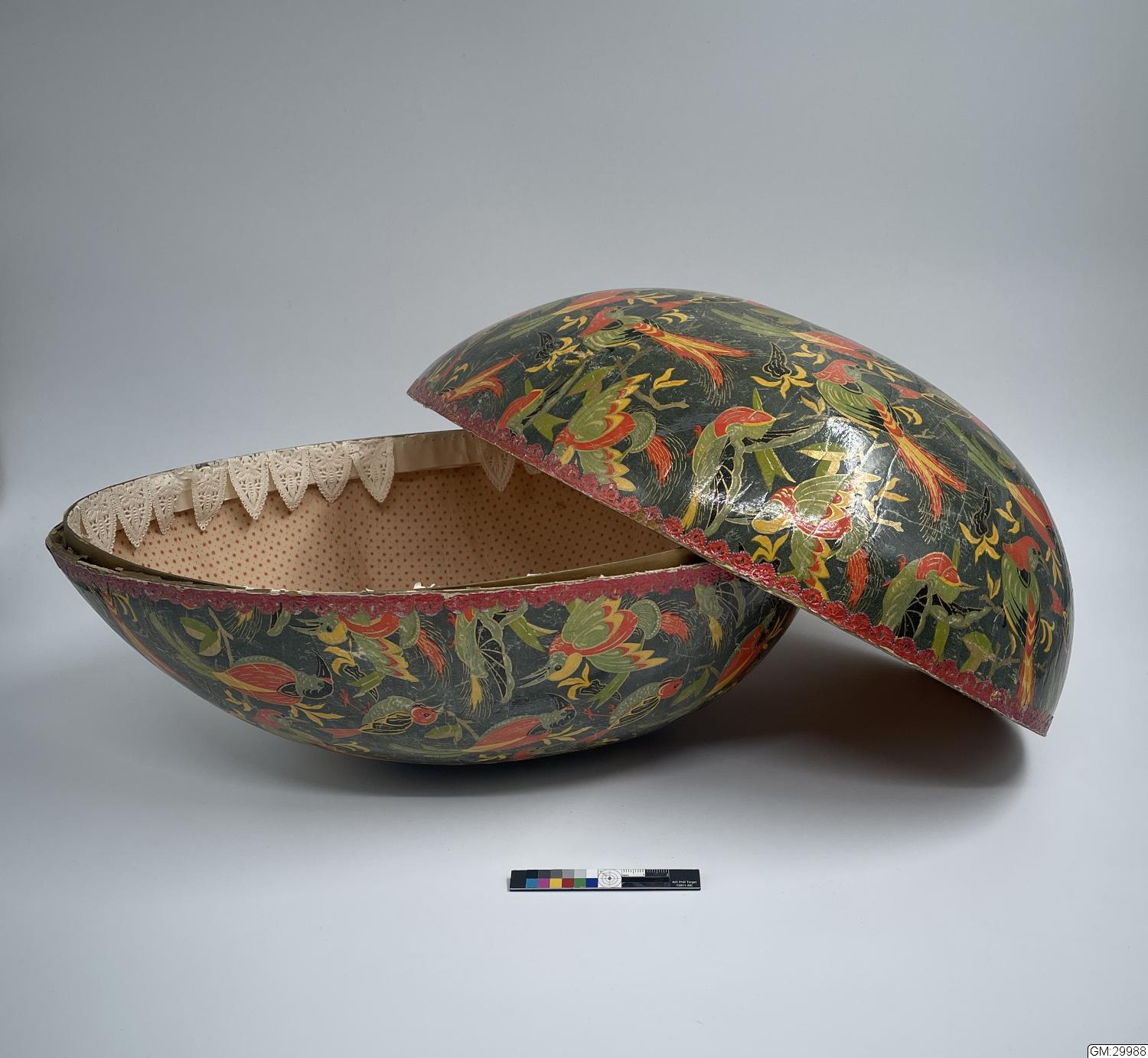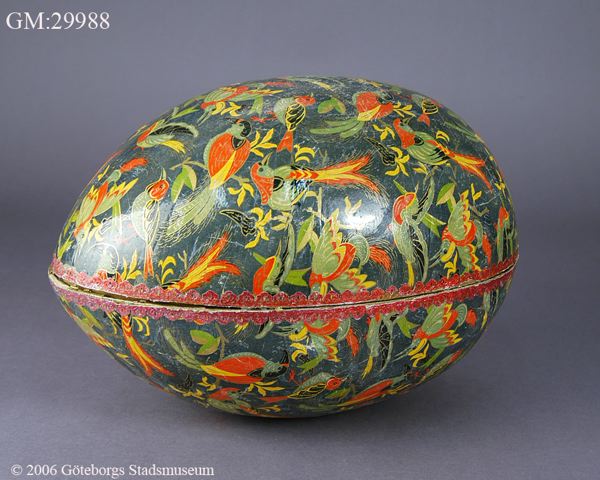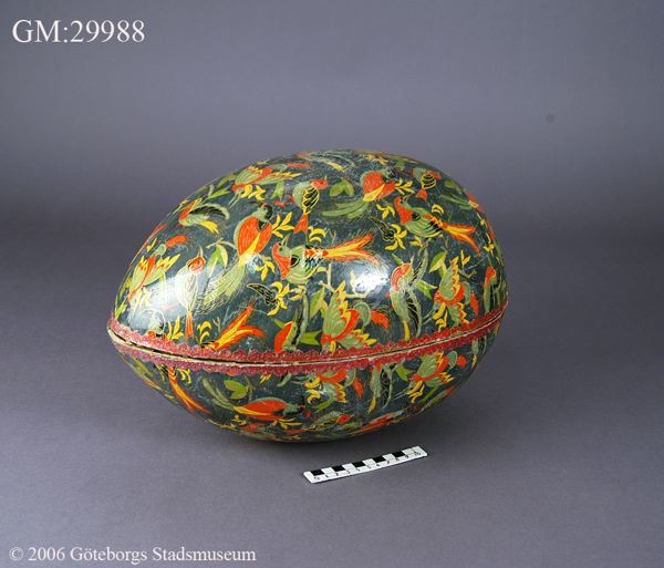 - Tvådelat påskägg av papp och papper. Polykrom utsida med exotiska fåglar, röd genombruten spetsuddig pappersbård längs kanterna.#Invändigt klätt med stjärnmönstrat papper och på underdelens kant en vit spetsuddig genombruten pappersbård, några av uddarna har gått av. Underdelen märkt GM 29 988:1 och överdelen #GM 29 988:2