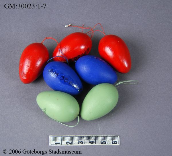 7 st påskägg att hänga i påskris. Äggen är gjorda i massivt trä, och målade i blått (delobjekt 1-2), grönt (3+7) samt rött (4-6).