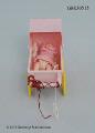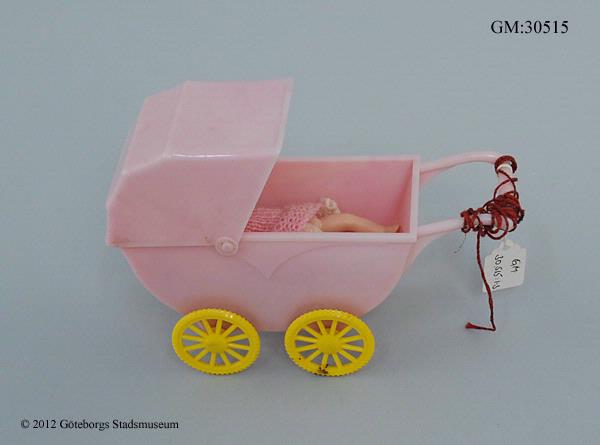 Liten dockvagn i rosa plast med vinklingsbar suflett och gula plasthjul. I vagnen ligger en liten vit och rosarandig stickad yllefilt och en liten plastdocka med stickad rosa dräkt och vita underbyxor. På vagnens handtag är ett rött snörre virat, oklart om detta hör till dockvagnen vid förvärvet.