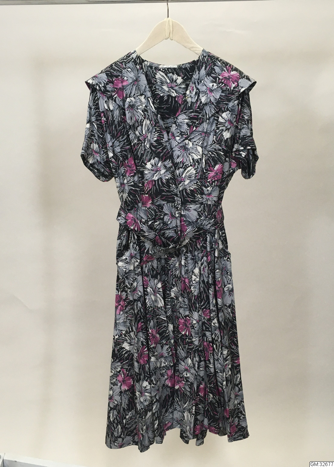 Från katalogkort: 1) Klänning av bomullstyg med svart botten och stora blommor i grått, vitt och lila. Knäppning hela vägen framtill (slagna knappar). Avskuren midja. Schalkrage. Korta holkärmar. Veck på kjolen. Inskurna fickor. Längd 125 cm, Midja 80 cm, vidd 106 cm.