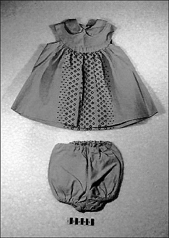 1/ Klänning med tuskaftat ljusblått bomullstyg med brun-vitt rutmönstrat inslag mitt fram och bak på kjolen som är fastrynkad vid rundat ok med liten krage. Inga ärmar. Knäpps i ryggen med tre knappar.
