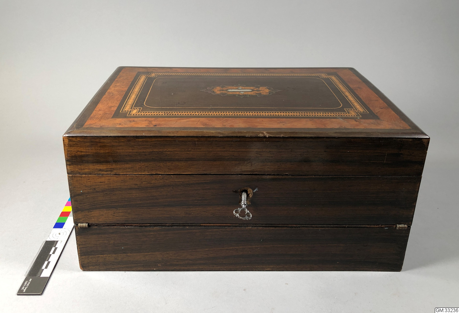 - Sy- och skrivschatull med tillbehör. 1) Träskrin, rektangulärt mahognyfanerat, pärlemorinläggningar, fastsittande lock, invändigt spegelförsett. 2) Sybehörslåda, klädd i lila sammet, av trä. I mitten nedsänkt hjärtformigt hål. Vid sidorna löstagbara. 3-4) lock klädda i samma tyg. Ovanpå små metallknappar. 5) trädningsnål av blomsterornerat gulmetall (trasig). 6) stoppnål. längd 6 cm. 7) nålhus, svärdliknande av ornerat gulmetall med löst lock l. 6,3 cm. 8) nålhus avlångt, av gulmetall, med lock l. 5,5 cm tj. 1 cm. 9) Oljeflaska av gulmetall. Platt med kulformad skruvkork. l. 6,8 cm. br. 3,8 cm. 10) sax av metall med hänklar av ornerat gulmetall (en är lös). l. 10 cm. 11) syl av metall med skaft av ornerat gulmetall. l. 8,2 cm. 12) kniv, pennkniv, av metall med skaft av ornerat gulmetall. l. 9,2 cm. 13-14) 2 st bläckhorn av glas, fyrkantiga. Lock av kork och gulmetall med ring. Sida 3,2 cm. h. 4,4 cm. 15) nyckel till skrinet. Längd 3,2 cm.