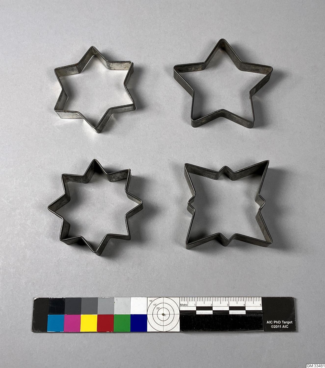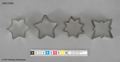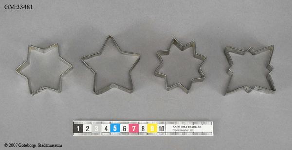Pepparkaksmått: fyra st stjärnformer. TIllverkade på 1930-talet; gåva till museet 1976.