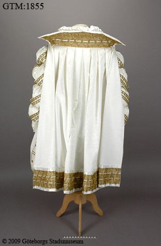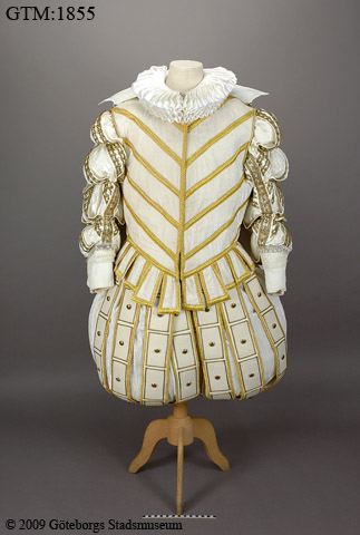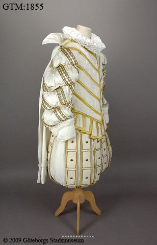- Herrdräkt bestående av jacka, kortbyxor och mantel. Dräkten är sydd med inspiration av klädedräkten vid engelska hovet vid tiden för sekelskiftet 1500-1600.