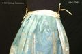 2: Hellång kjol sydd i sex raka våder (tygbredd 47cm) med sprund i sidorna upptill. Tre våder fram och tre våder bak med söm i sidorna. Påsytt enkelt vitt bomullsband på både fram- och ryggstycke i midjan som knytes omlott runt midjan både fram och bak. Lagda veck runt hela midjan. Det fina mönstervävda sidenet går upp till midjan endast mitt fram i en 46cm bred våd. Resten av kjolens överdel är skarvat med ett enklare sidentyg i hemmelsblått. Kjolens nedre del är dekorerad med påsydda genombrutna sidenband (snörmakerier) i himmelsblått och vitt med små vita tofsar i korsade vågformationer bildandes "åttor". Nederkanten är kantad med samma sorts band. Längd: 98-103cm, Vidd nedtill 278cm (139+139), vidd midja fram: 47cm, vidd midja bak: 30cm.